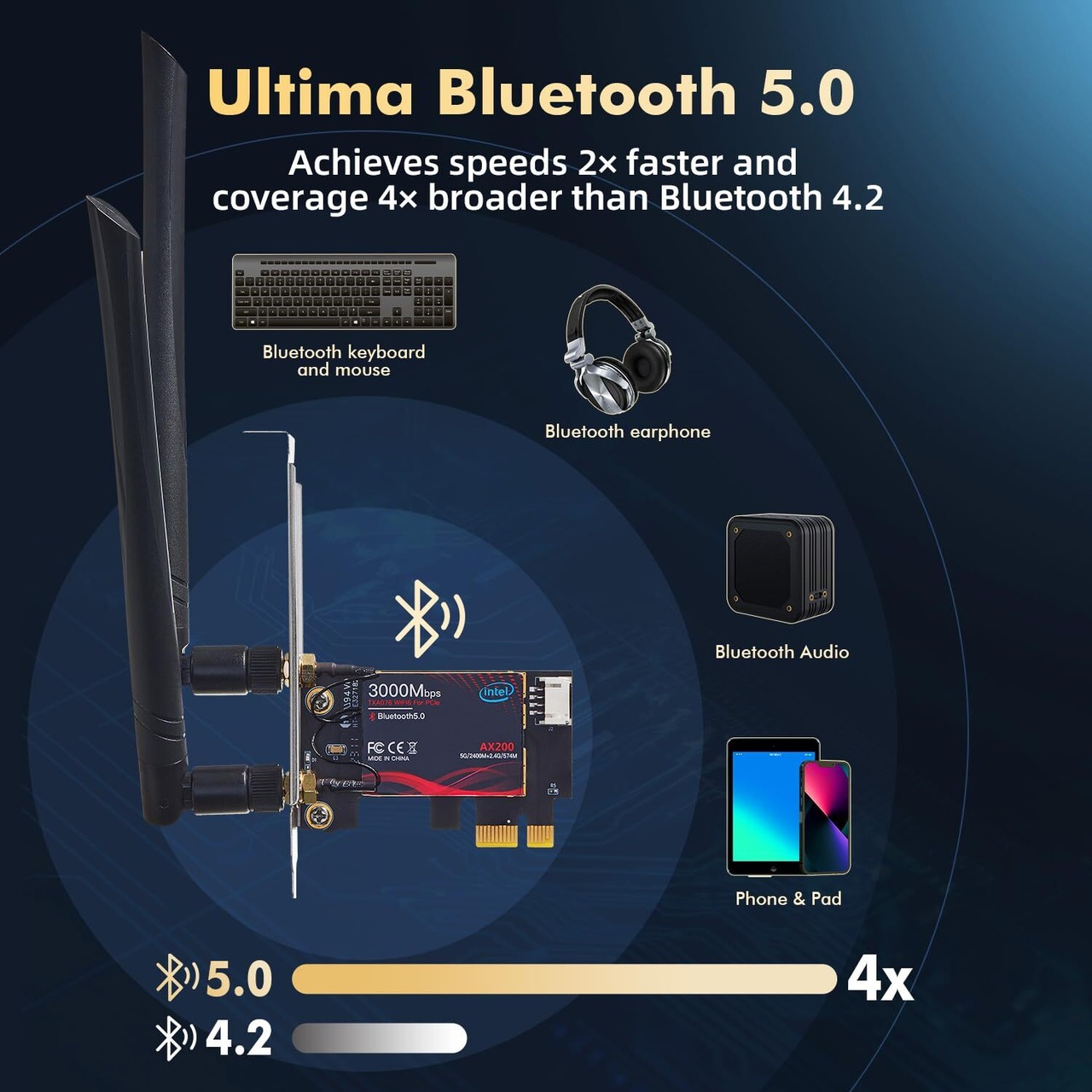 Binardat WiFi6カード AX3000 PCIe WiFiネットワークアダプター Intel AX200チップ Bluetooth 5.0 デュアルバンド 2.4GHz/5GHz OFDMA & MU-MIMO Windows 10/11