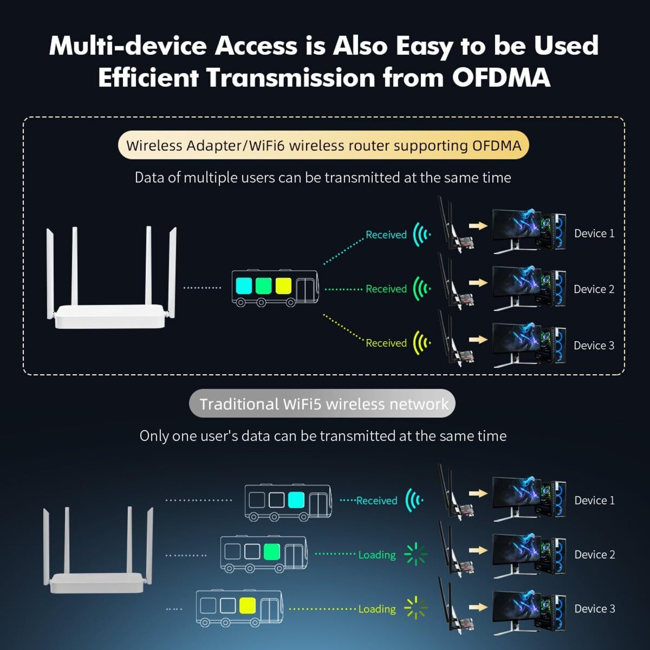 【OFDMA & MU-MIMO】OFDMAとMU-MIMOテクノロジーにより、複数のユーザーが同時にサービスを提供する際の遅延を最小限に抑え、消費電力を抑え、信号ゲインを向上させます。 ゲームでもHDビデオを楽しむ場合でも、当社のカードは、忙しいネットワークでも超応答性とスムーズなパフォーマンスをします。