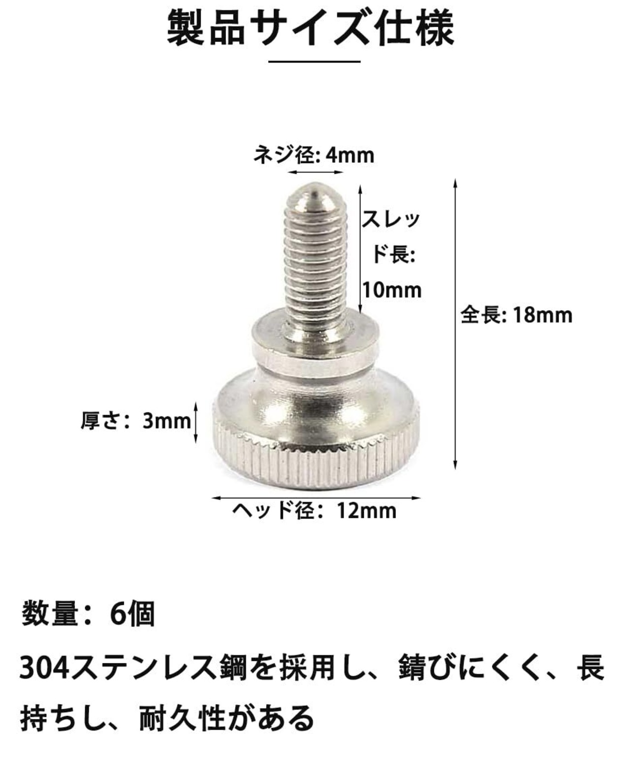 304ステンレス鋼製のノブねじ6個がパッケージに含まれています