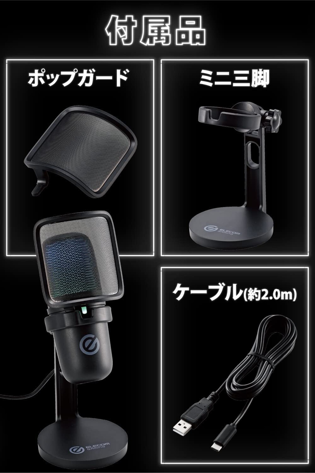 エレコム コンデンサーマイク USB接続 [ タッチミュート機能/マイクアーム固定可能/LEDライト/ポップガード ] 単一指向性 ブラック HS-MC14UBK