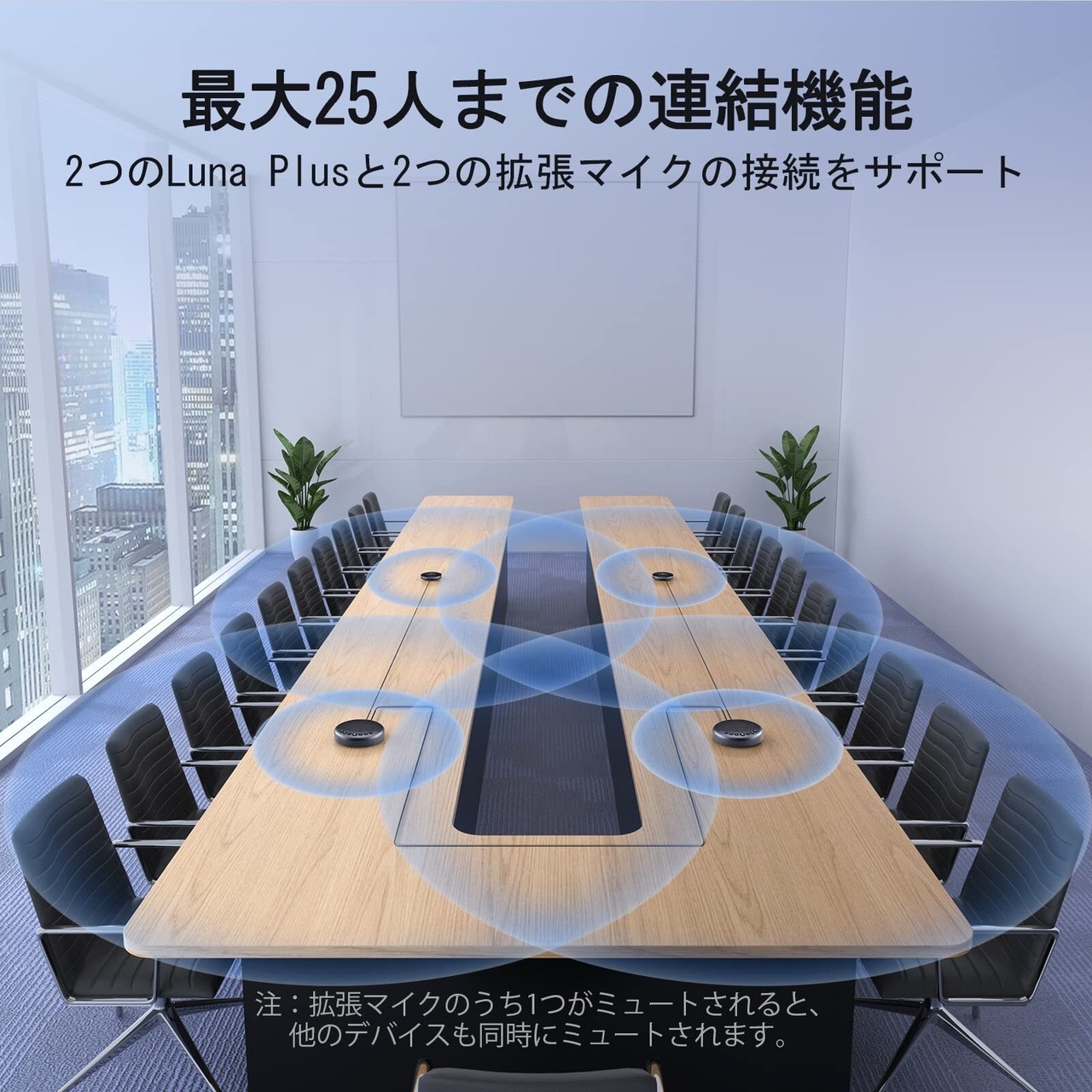 【連結機能&大規模な会議も対応】EMEET Luna Plus Kit会議用スピーカーは、連結機能により、さまざまなシーンに対応したカバー範囲の拡張が可能です。EMEETの専用連結ケーブルを使って会議用スピーカーフォンを接続し、25人まで参加可能な会議をサポートできます。会議用スピーカーの有線接続技術は、無線接続とは異なり、安定した接続をし、干渉のない通話を実現します。