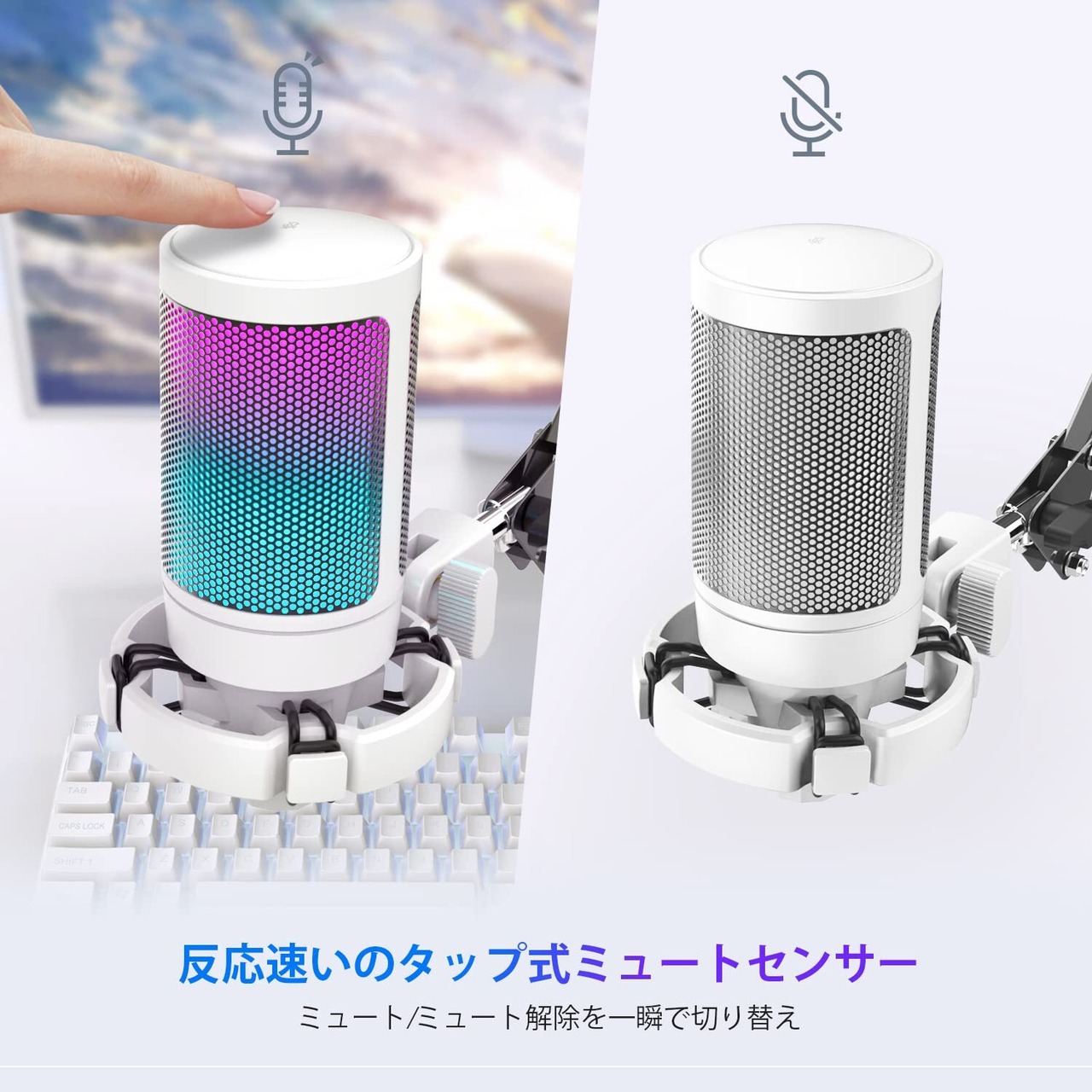 【独特なRGBライティング】FIFINE AmpliGameのRGBライティングは高級のゲーミング没入感と独特なパーソナリティを様々なコンビネーションで実現できます。マイク上部の高速反応タッチミュートボタンを利用すると、マイクのミュート/ミュート解除の状態を瞬間で切り替えます。マイクがミュートされたらRGBライティングがオフし、マイクの状態を直感的に感知できます。