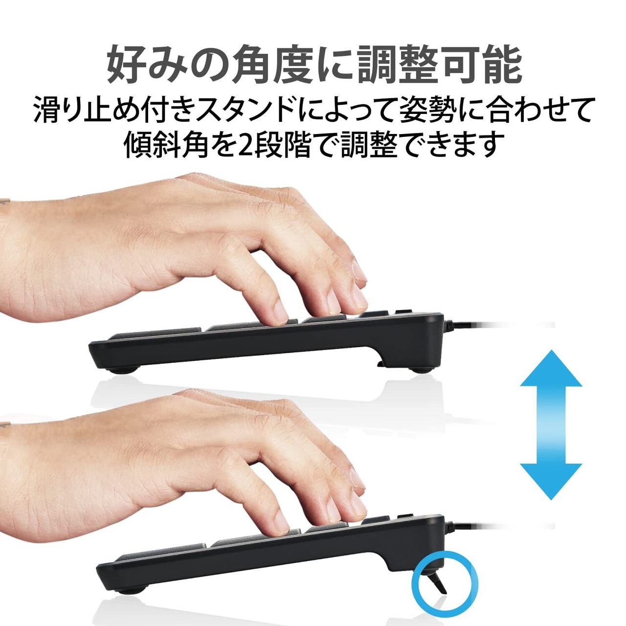 ■姿勢に合わせて傾斜角を2段階で調整できる“角度調整スタンド"付き。また、スタンドにはしっかりしたキータッチに役立つ“すべり止め"が付いています。