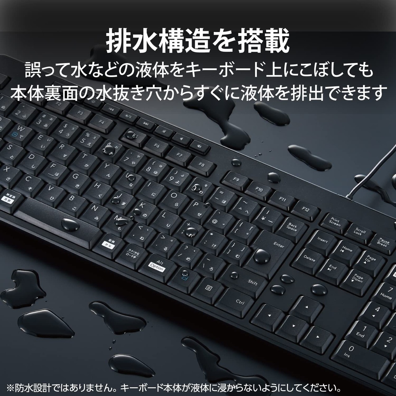 ■誤って水などの液体をキーボード上にこぼしても、本体裏面の水抜き穴からすぐに液体を排出できる排水機構を搭載しています。(防水設計ではありません)