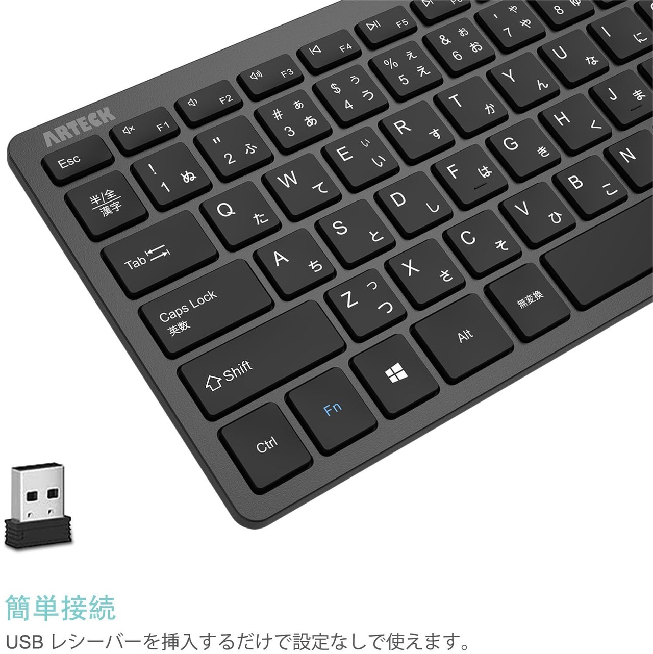 簡単接続:パソコンなどのUSBポートに商品付属のUSBレシーバー「キーボードの裏面、電池カバーの中に収納され」を挿入だけで使えます。