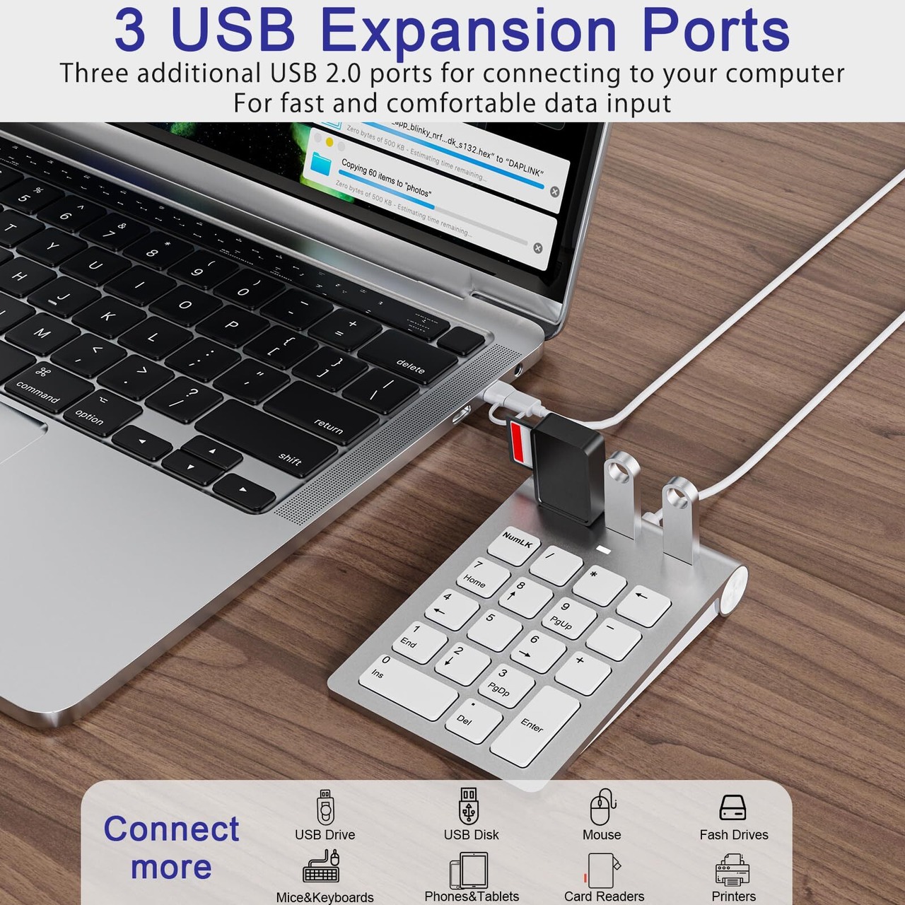 【3 つの USB 2.0 ポート - 拡張設計】テンキー機能に加えて、このキーボードには 3 つの追加 USB 2.0 ポートも装備されており、マウス、U ディスク、外付けハードドライブ、その他の周辺機器を簡単に接続できます。この統合設計により、効率的なマルチタスクのサポートが提供されるだけでなく、デスクトップのスペースが節約され、よりクリーンで整理された作業環境が提供され、作業効率が大幅に向上します。