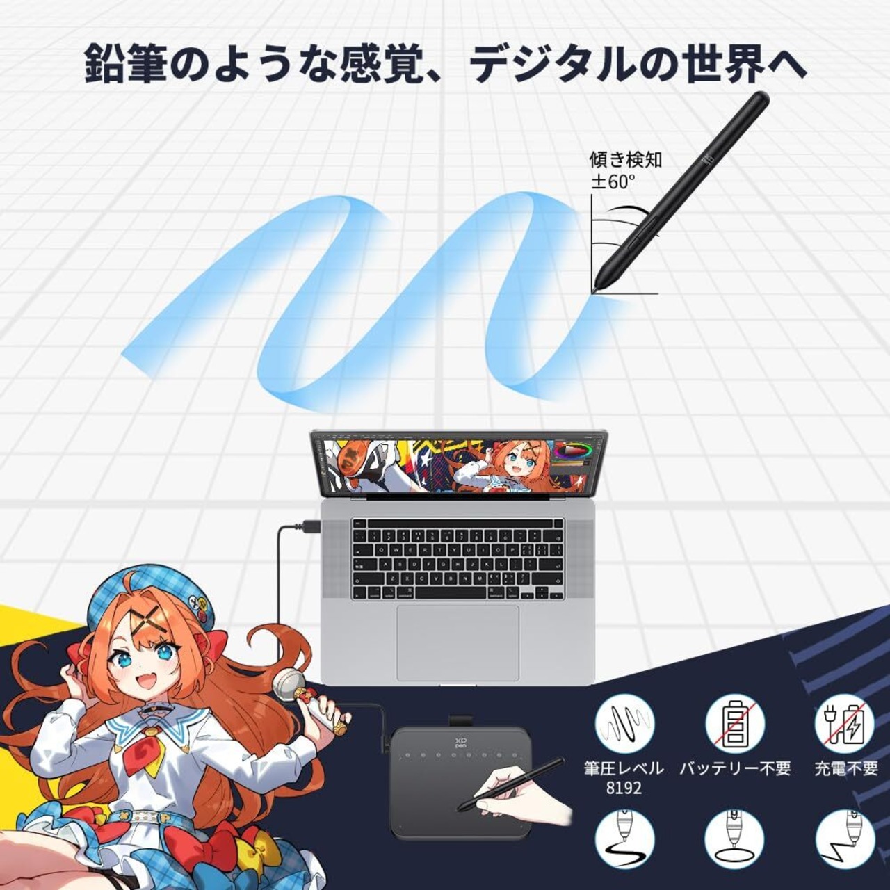 【手頃なサイズ・繊細な描画】Deco 640板タブの寸法は149.96 x 188.34 x 7.7mm。8192レベルの筆圧感知により、同時に、60°傾き検知に対応することで、影のストロークや豊かな線のバリエーションを簡単に描け、まるで紙に描くように、タブレットで自由に描きやすくなります。