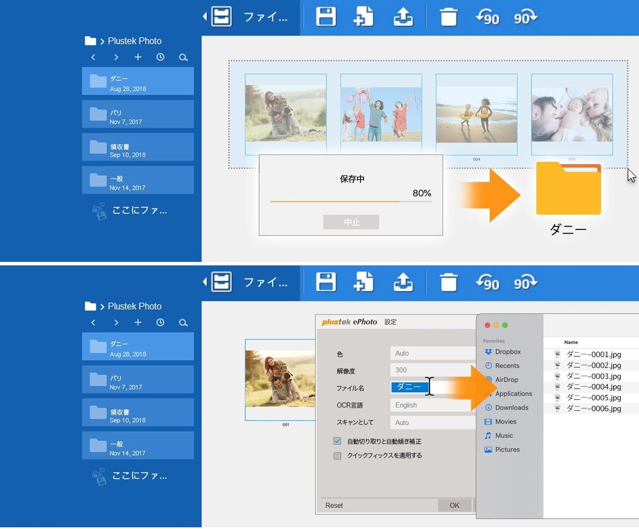 KG判 (4x6) の写真 1 枚で 2 秒、A4サイズ (8x10)の写真 1 枚で 5 秒 @300dpi。 約 1000 枚の写真を簡単に変換してファイルをデジタル化し、家族や友人と 共有できます。