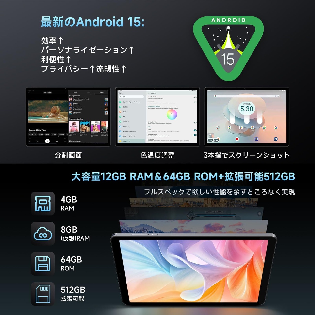 ✨【最新 Android 15 タブレット - 4G LTE 対応】✨ 最新の Android 15 オペレーティングシステムを搭載した ALLDOCUBE iPlay 60 ミニタブレットは、ユーザーのカスタマイズ、保護、アクセシビリティを強化し、健康、セキュリティ、データプライバシー保護を改善し、アクセシビリティを拡張します。 4G LTE バージョンなので、高速インターネットアクセスをサポートするだけでなく、通話機能も備えており、いつでもどこでも接続を維持できます。