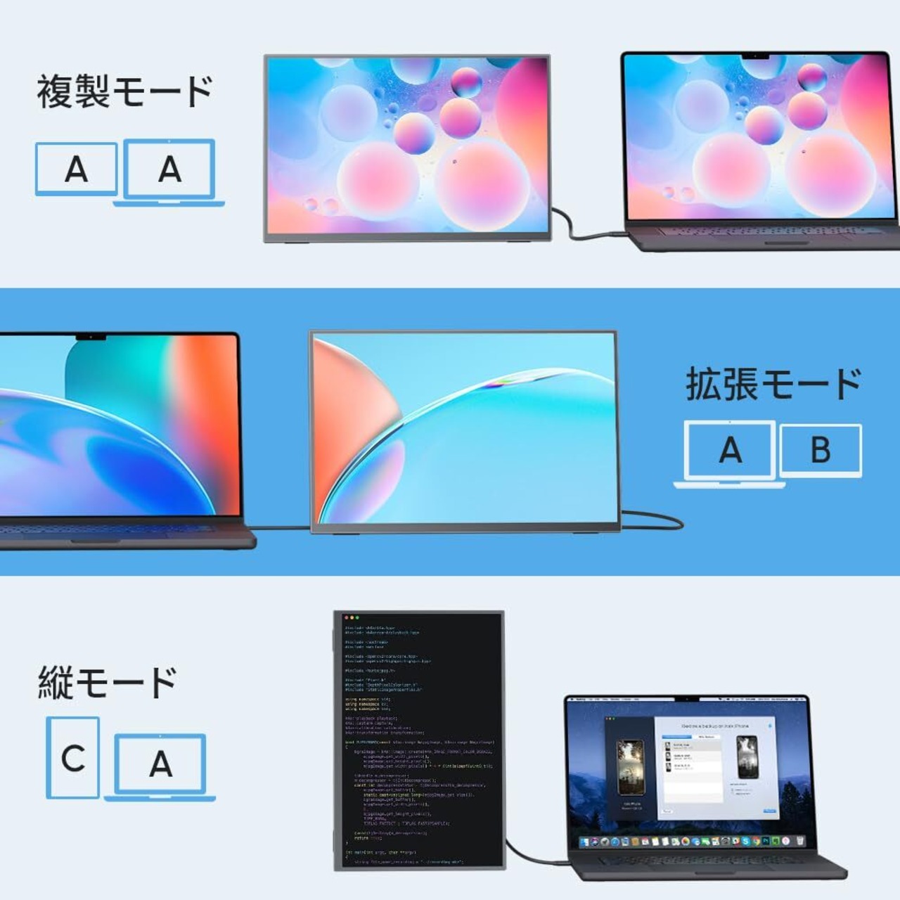 【ご注意】①USB Type-C to Type-Cで接続する際は、出力デバイスのType-CポートがDP Alt Mode対応である必要があります。購入前にインターフェースをご確認いただき、対応していることを確認すれば、スムーズに接続できます。 ②Type-Cケーブル1本で接続端末から電源を取る場合、端末の電力不足により給電が不安定になることがあります。その場合は、別途電源を供給してください。HDMI接続時も別途電源が必要です。