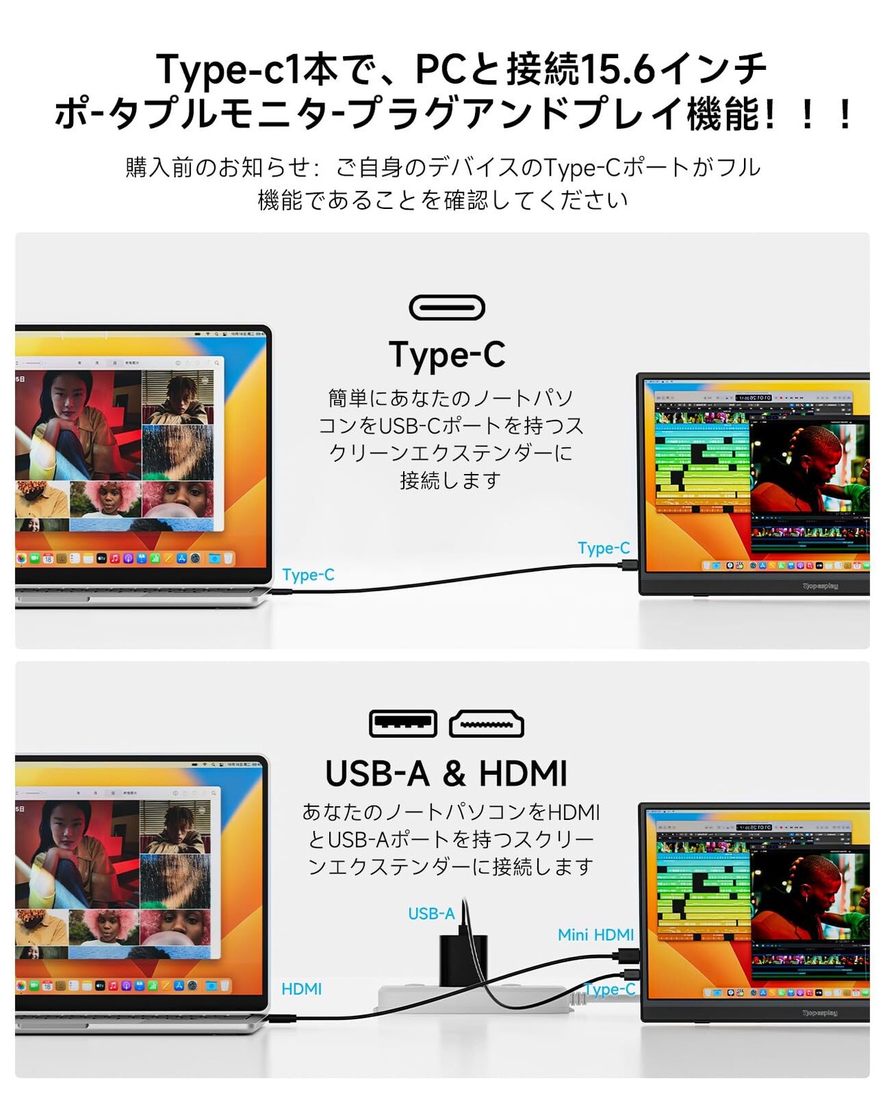 【シンプルな接続と利便性】DopesplayポータブルディスプレイはUSB Type-Cケーブル1本で映像信号と電源供給が可能で、電源コンセントが不要。Mini HDMI端子も搭載し、さまざまなデバイスにシームレスに接続できます。HDMI接続にも対応しており、幅広い機器に柔軟に利用できます。