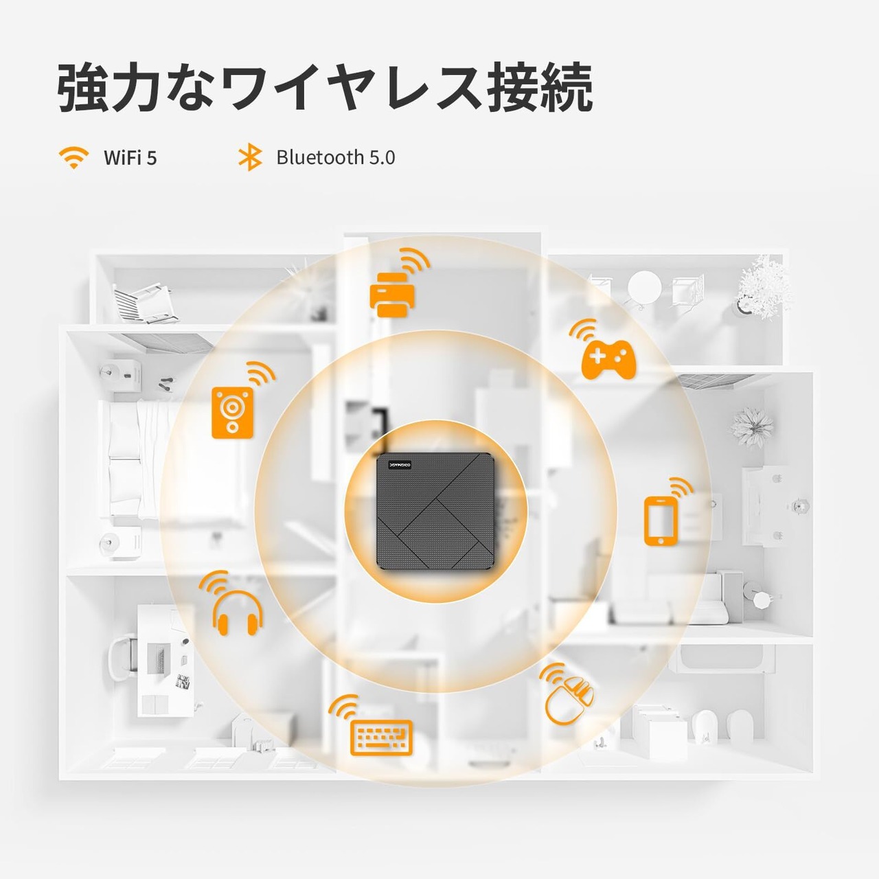 【高速接続、安定性と信頼性】Origimagic C4 ミニコンピュータはデュアルバンド Wi-Fi (2.4GHz/5GHz) を搭載しており、より安定したネットワーク接続とより高速な伝送速度を提供し、オンライン ゲームや 4K ビデオの再生をスムーズかつスムーズに行えます。また、Bluetooth 5.0テクノロジーもサポートしており、接続範囲が広く消費電力も低いため、ワイヤレスヘッドホン、キーボード、マウスなどの周辺機器と簡単にペアリングでき、効率的なファイル転送や複数デバイスでの連携が可能で、真のゼロ遅延ワイヤレス体験を実現します。