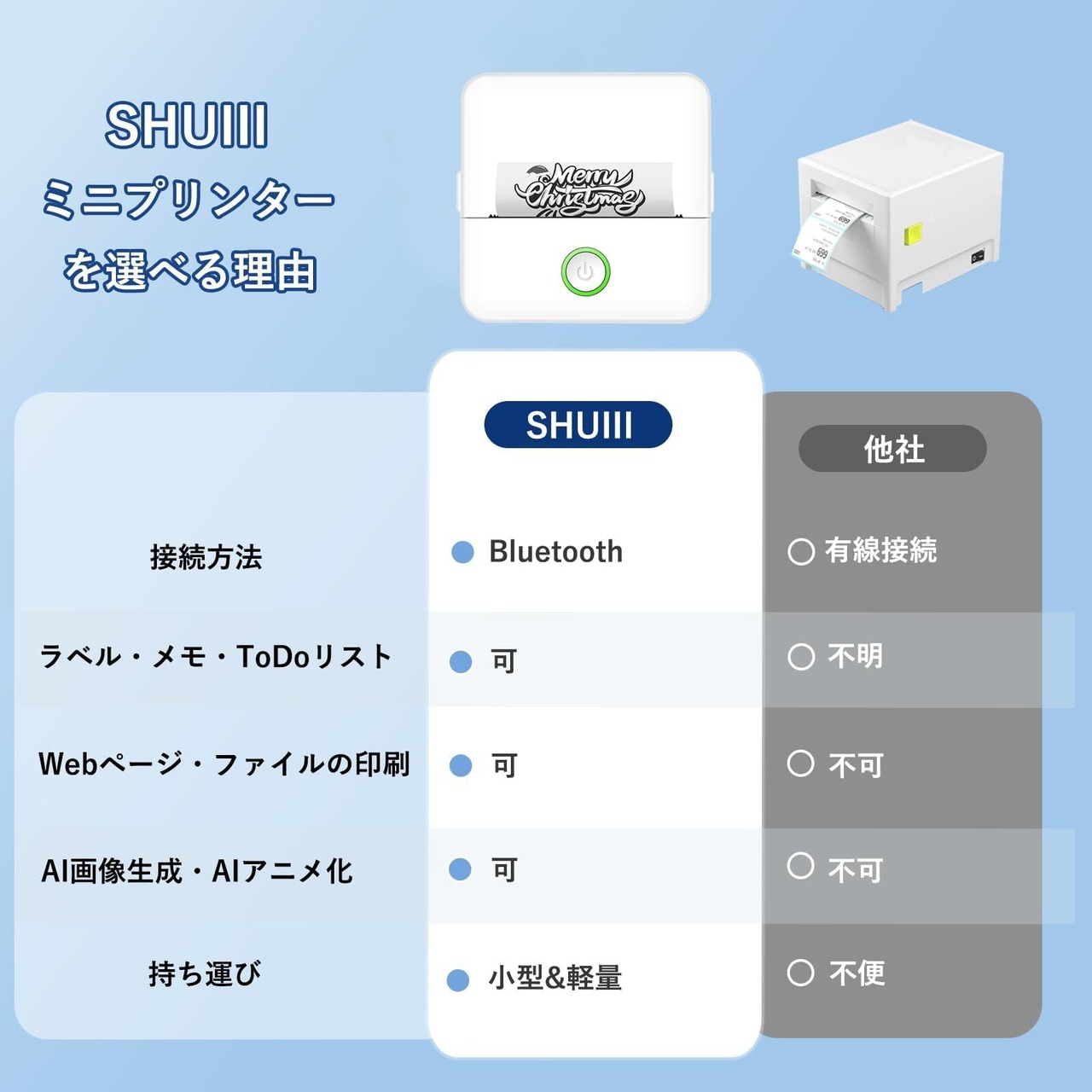 SHUIII スマホプリンター ミニプリンター スマホ対応 【AIアニメ化&画像生成AI】 サーマルプリンター Bluetooth接続 USB充電式 1200mAh モバイル Android iOS対応 ポータブル 小型 モノクロ ラベル 勉強/ノート/写真/リスト/メモ/手帳/領収書/ラベル/テレワーク/業務用/家庭用 感熱紙 2ロール カッター付き