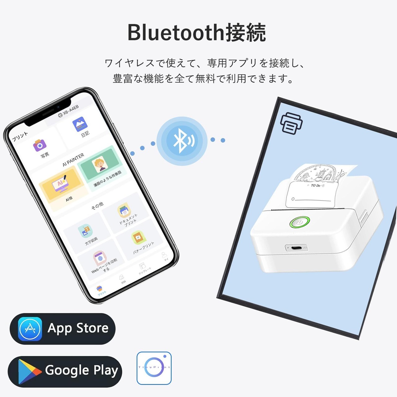 【Bluetooth搭載&IOS・Android対応】スマホ対応のモバイルプリンターで、無料専用アプリ「Tiny printer」からBluetooth で簡単に接続してコードレスで印刷することができます。専用のアプリはiOS、Androidの両方に対応しており、さまざまな機能が簡単に使えるし、レシートやメモの印刷だけでなく、スマホから転送した写真やファイル、Webページなど、様々なものを印刷できるし、専用アプリで印刷前の文字やイラストもデコレーションできて、便利です。