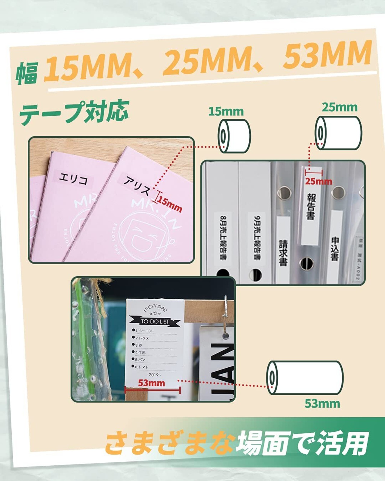 テープ印刷可能:53 mmの印刷用紙を印刷できるだけでなく、整理収納に適した25 mmと15 mmのテープも印刷できます。ラベルボックスのテンプレートを使用し、場所や用途に合わせて自由にテンプレートをお選びできます。お洒落かつ 約40種類感熱ロール紙の印刷を楽しめる
