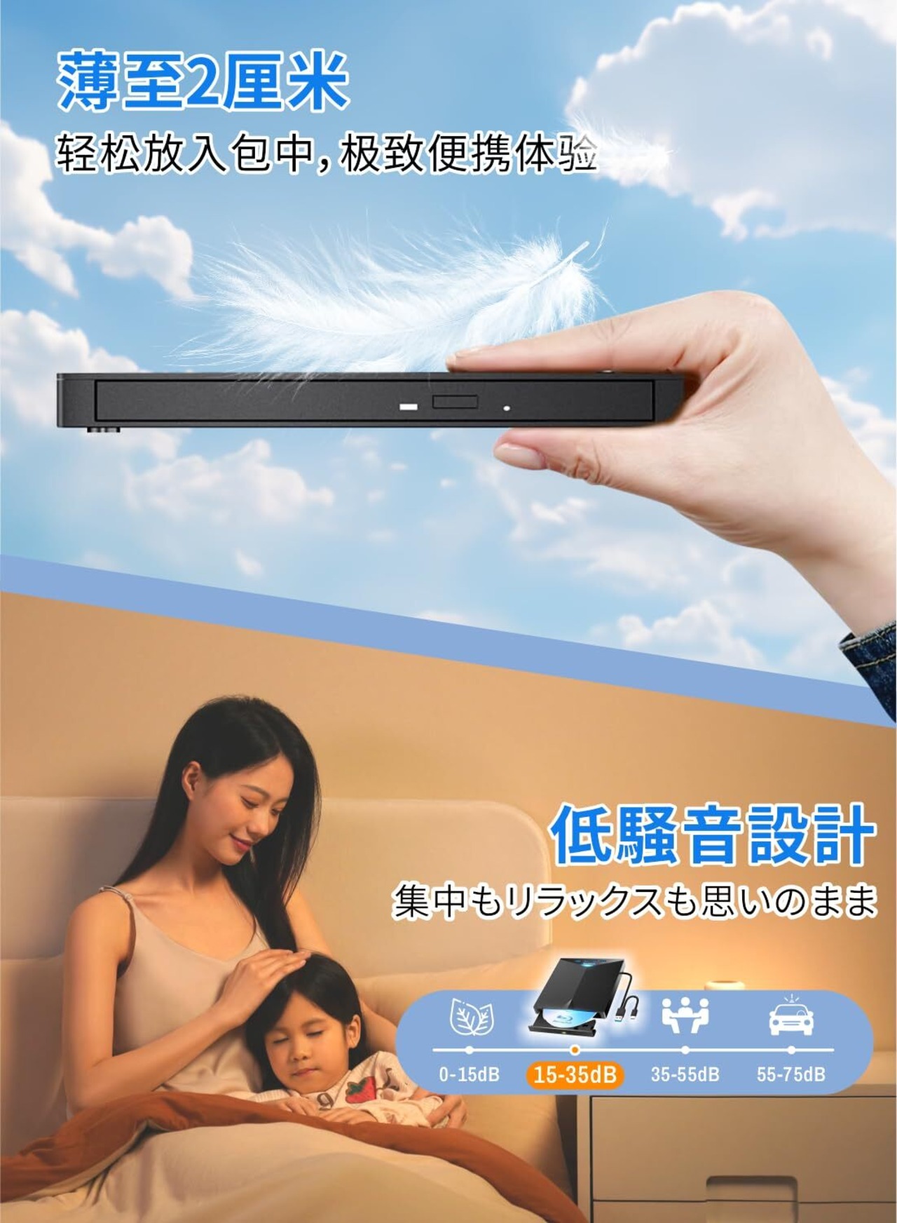 【プラグ&プレイ、便利な使用】外付け DVD ドライブにドライバ不要で、USB 接続だけで即使用可能。DVD ドライブ 外付けとして映画鑑賞、ソフトウェアインストール、データバックアップなどをサポート。優れたエラー補正と静音動作、滑り止め機能で安定性を確保します。(※iPad、スマートフォン、Chromebook、テレビ対応 DVD プレーヤー(dvd プレーヤー テレビ対応)には非対応)