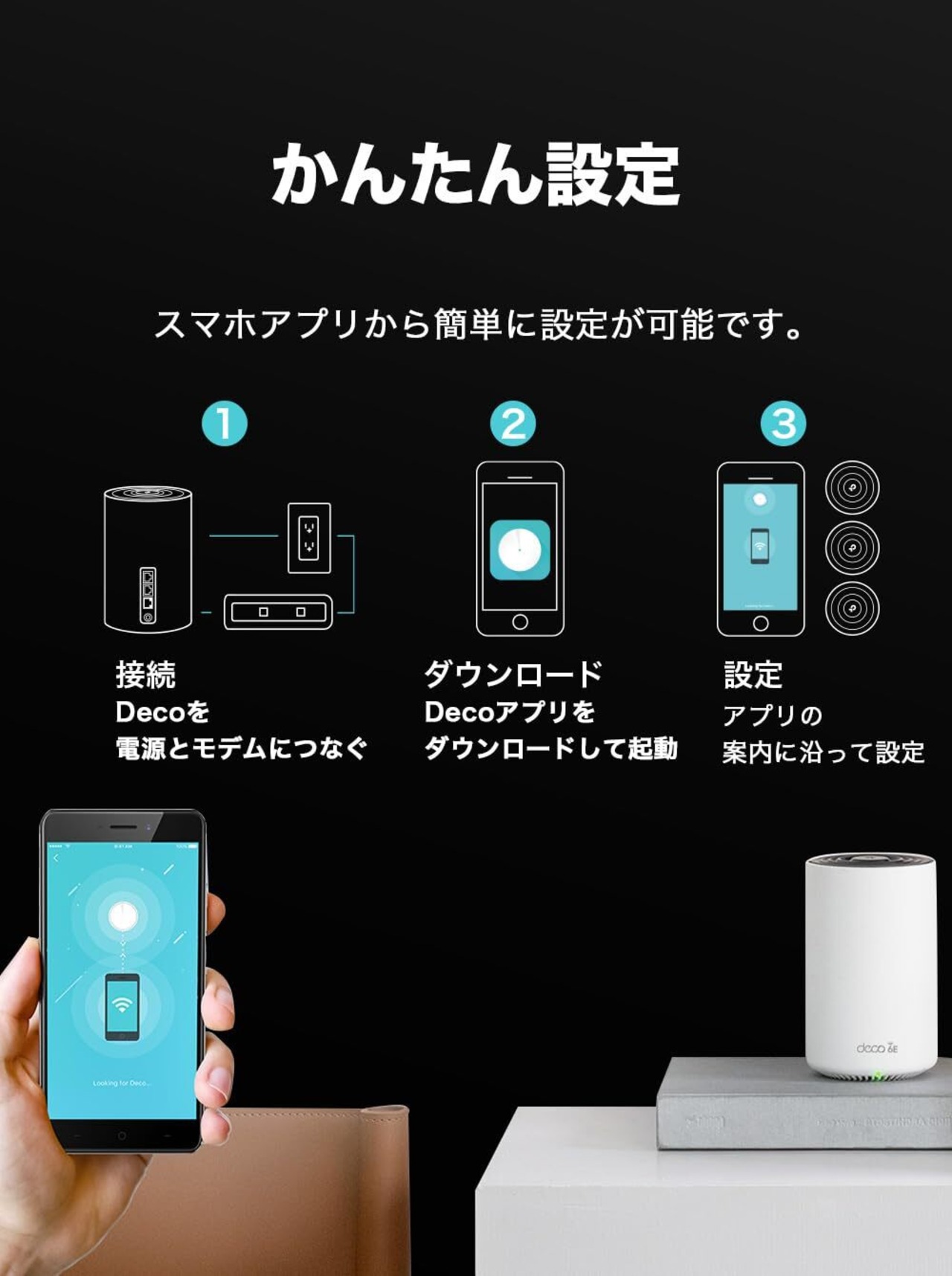 [特徴] Wi-Fi6Eで新たなメッシュWi-Fi環境を構築。新規格 6GHzにより、新次元のメッシュWi-Fi環境を体感。既存のDecoとの併用も可能。