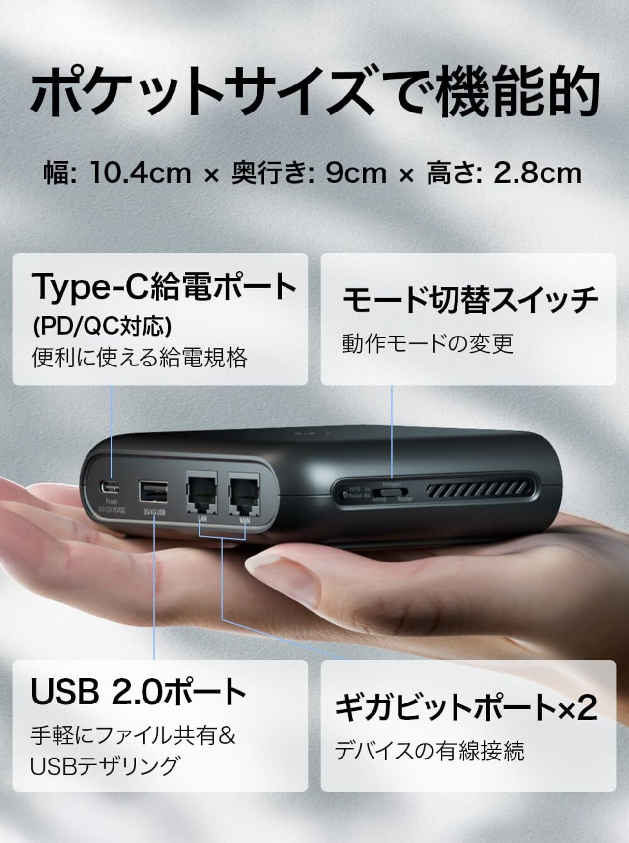 [コンパクト筐体] コンパクトなのでリモートワークや出張先、はたまたキャンプの場面でも大活躍(寸法:10.4 × 9 × 2.8 cm)