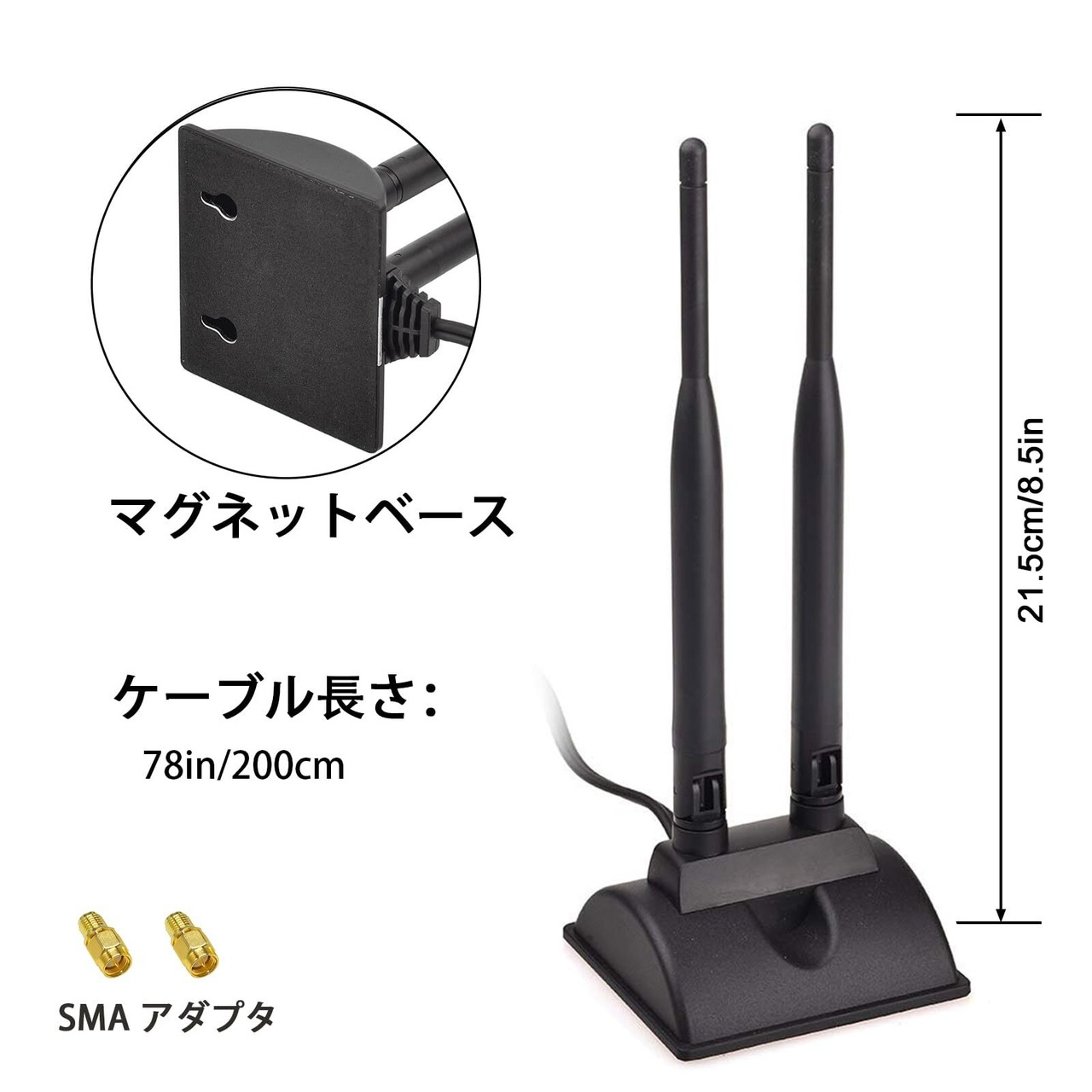 周波数: 2.4 / 5.8 GHz、インピーダンス: 50 オーム、ゲイン: 6dBi、ケーブル長: 2 メートル、RP-SMA コネクタ