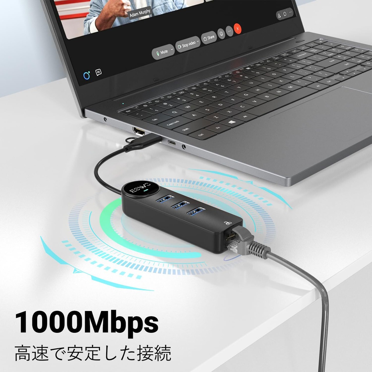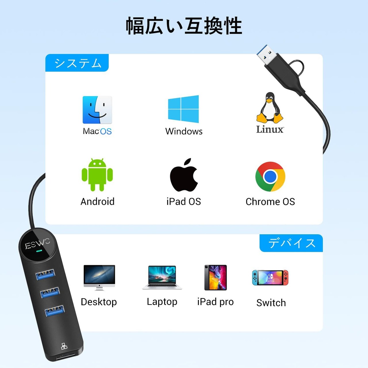 JESWO 2in1 USB C/USB A 有線LANアダプタ、USB 3.0*3 拡張 5Gbps超高速転送 10/100/1000Mbps 有線 LAN RJ45 ギガビット イーサネットアダプタ LEDライト付き iPad pro、Windows、Mac OS、iPad OS、Chrome OS、Linuxなどに対応 黒