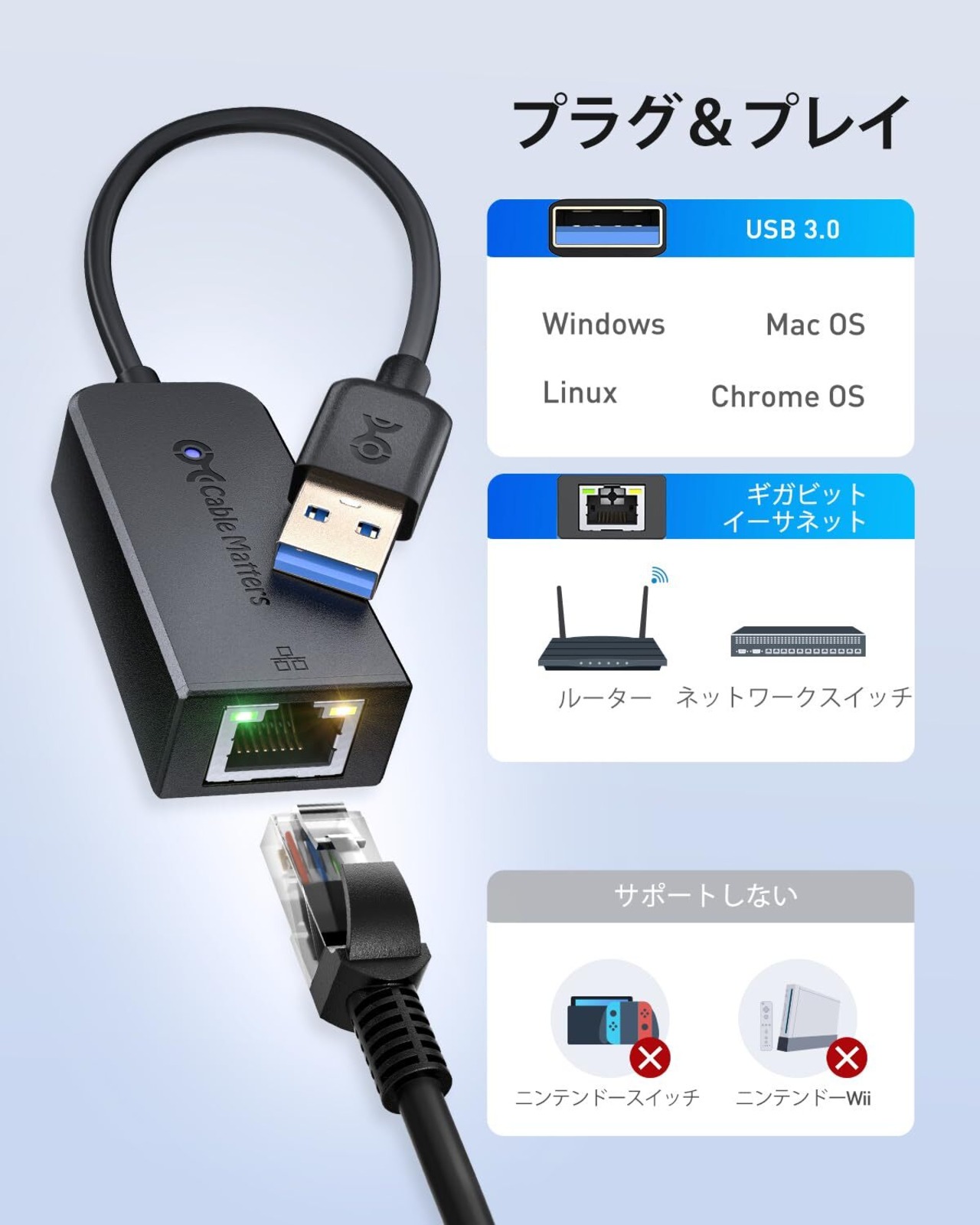 Cable Matters 有線LANアダプタ USB 3.0 - ギガビット イーサネット アダプター、USB 3.0-10/100/1000Mbps 高速 RJ45, 高速 RJ45 ギガビットイーサネット LAN ネットワークアダプター, 適合 MacBook Pro 2022/2021/2020、MacBook Air