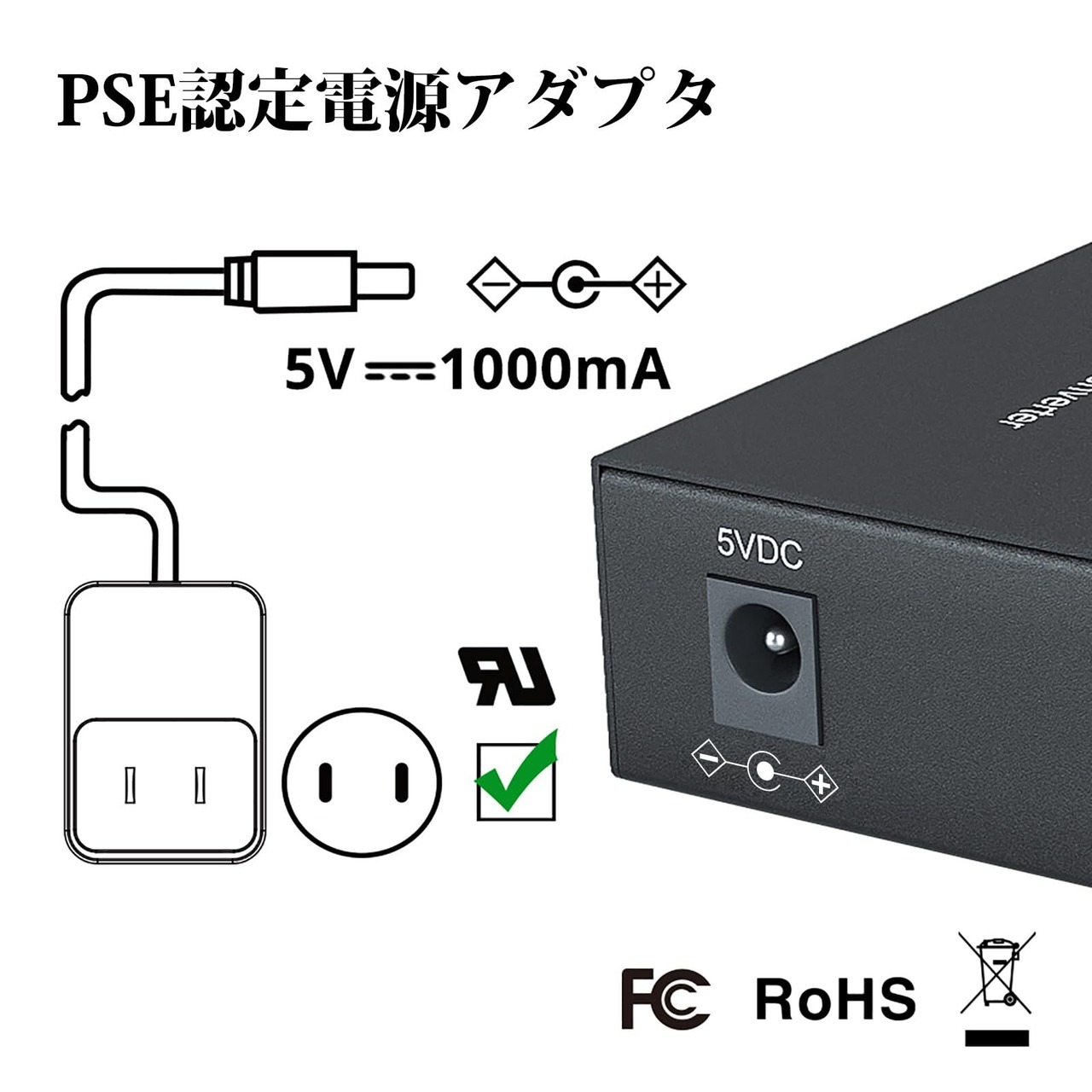 梱包内容:2*ギガビットメディアコンバータ、2*1000Base-SX SFP、2*DC電源アダプタ(5V-1A、PSE認定)、2*マニュアル。