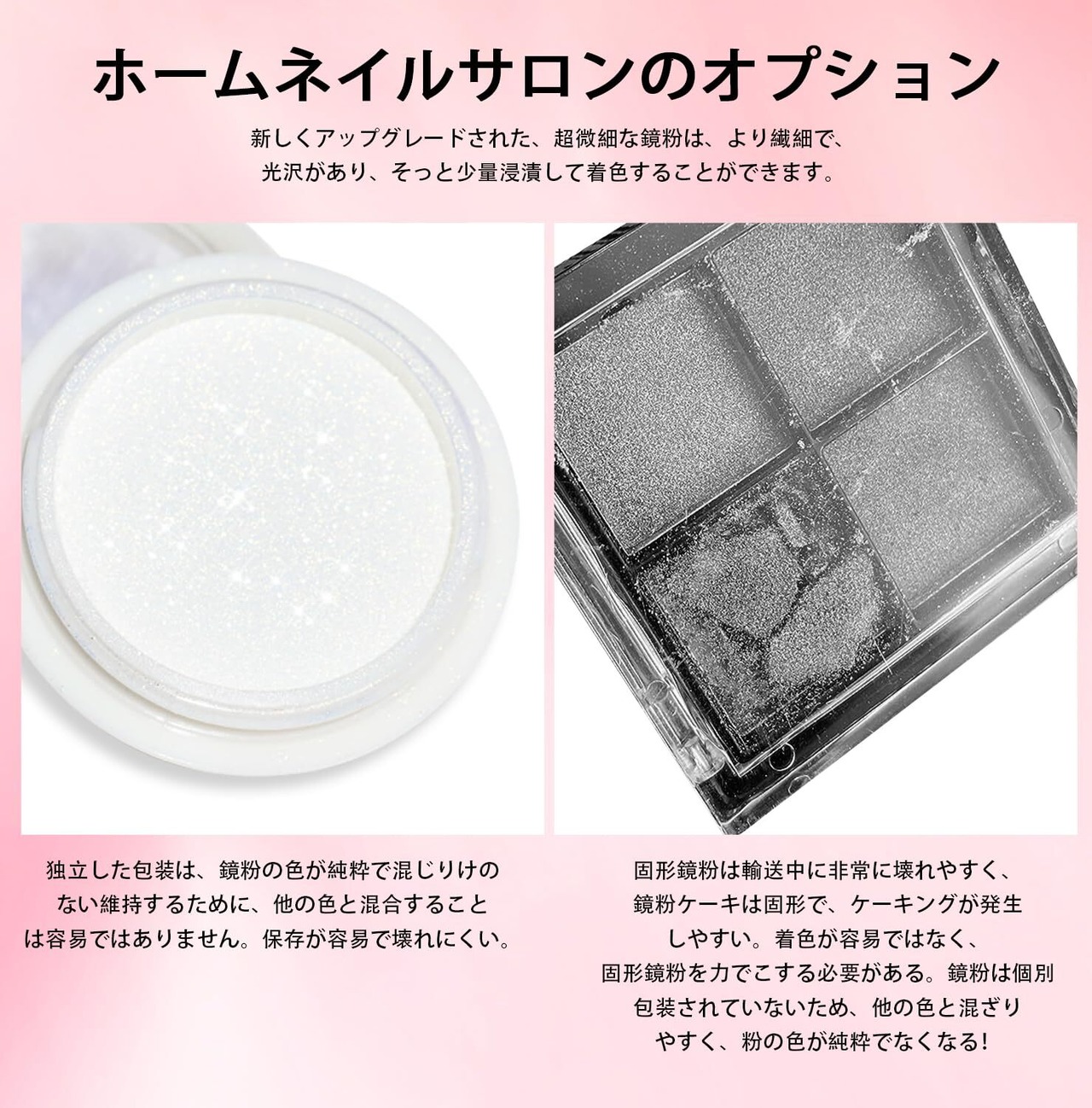 キラキラ ミラーパウダー: これらのミラーパウダーは、まるで 「妖精 」のような輝きを放ち、ホワイト ジェル ポリッシュの上に重ねることで、ラグジュアリーでエレガント、そして見事な仕上がりを実現します。ミラーネイルパウダーはベースカラーを輝かせ、光の加減で美しく変化する魅惑的なミラー効果を生み出します