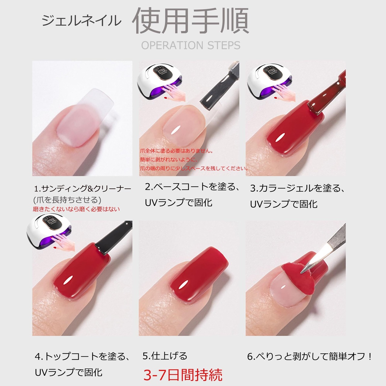 使いやすい:爪の表面をクリーニングします、剥がせるベースコートを塗っ、UV LEDネイルランプで60〜90秒で硬化します。剥がすときは、ピンセットを使ってジェルポリッシュの角をそっと持ち上げ、ゆっくりと剥がします。ジェルを剥がした後のベタつきがほとんど残らないので、綺麗にオフできます。