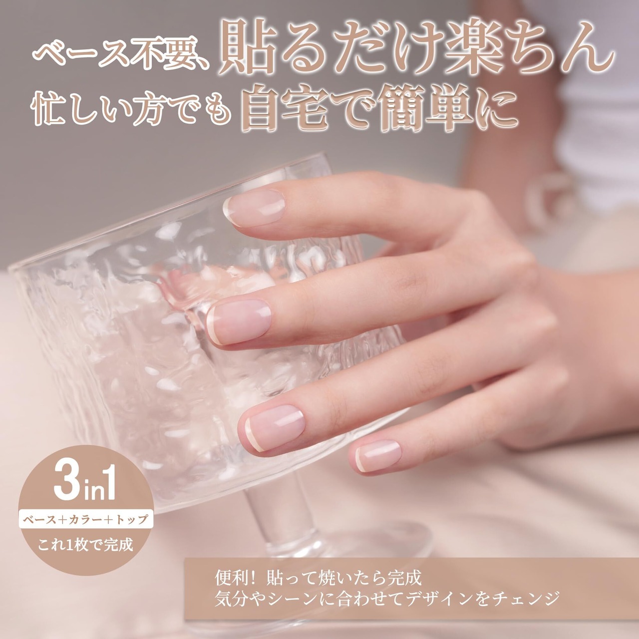 【爪に吸い付く、抜群のフィット感】 貼って固めるだけで簡単!ジェルネイルシールは、ジェル素材で伸ばしやすく柔らかいので、爪のカーブにピッタリ貼れます。さらに、UVライトで密着力を強化させるので、ネイルシールが浮き上がるのを抑えます。ちゃんとUVライトを当てたら基本的に2週間くらい持続できます。(※爪の状態や生活習慣によって持ちは異なります)