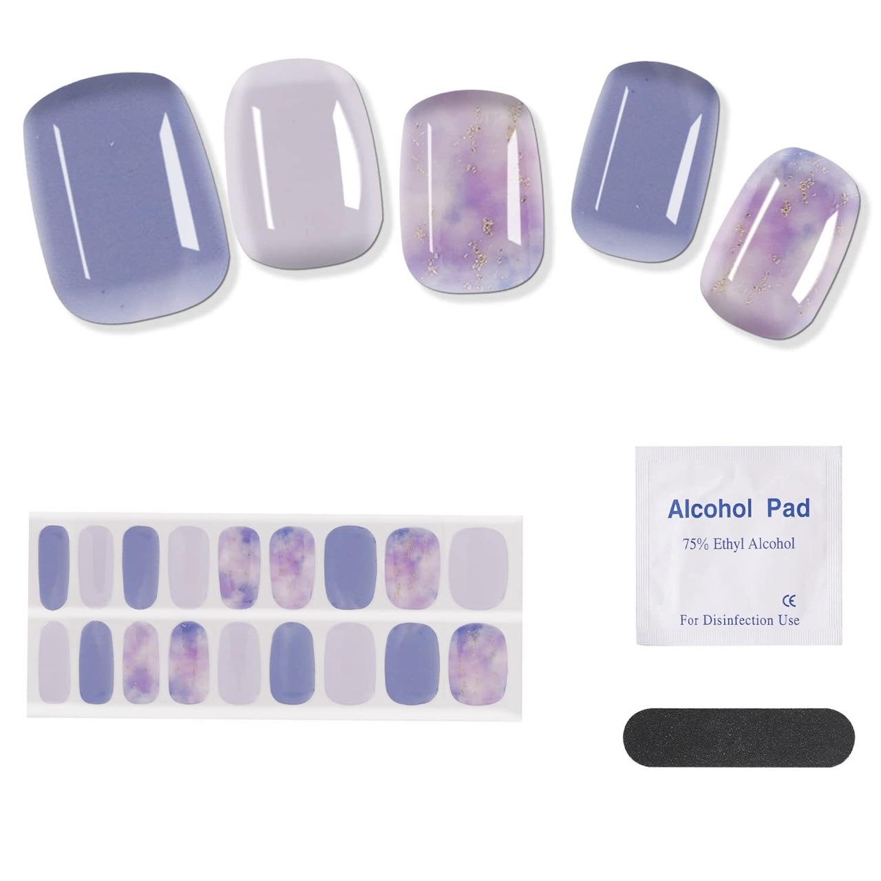 【パッケージリスト】ジェルネイルストリップセットには、フルネイルジェルステッカー24枚、ネイルファイル1枚、ネイルスティック1枚、シール1枚が入っており、ご自宅でのネイルアートをより便利に。
