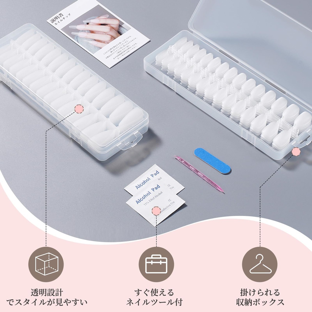 【大容量&マルチに使える】本製品は合計300枚入りの大容量セットで、繰り返しの練習や多彩なデザインに挑戦するのに十分な量を確保。透明タイプの付け爪は、長い爪を維持できない方の代替アイテムとして便利で、自分好みにデザインできるDIYネイルにも最適です。セルフネイルはもちろん、ネイルサロンのサンプル展示やスクールの練習用としても活躍。家でも外出先でも手軽に使え、コスパも優秀。