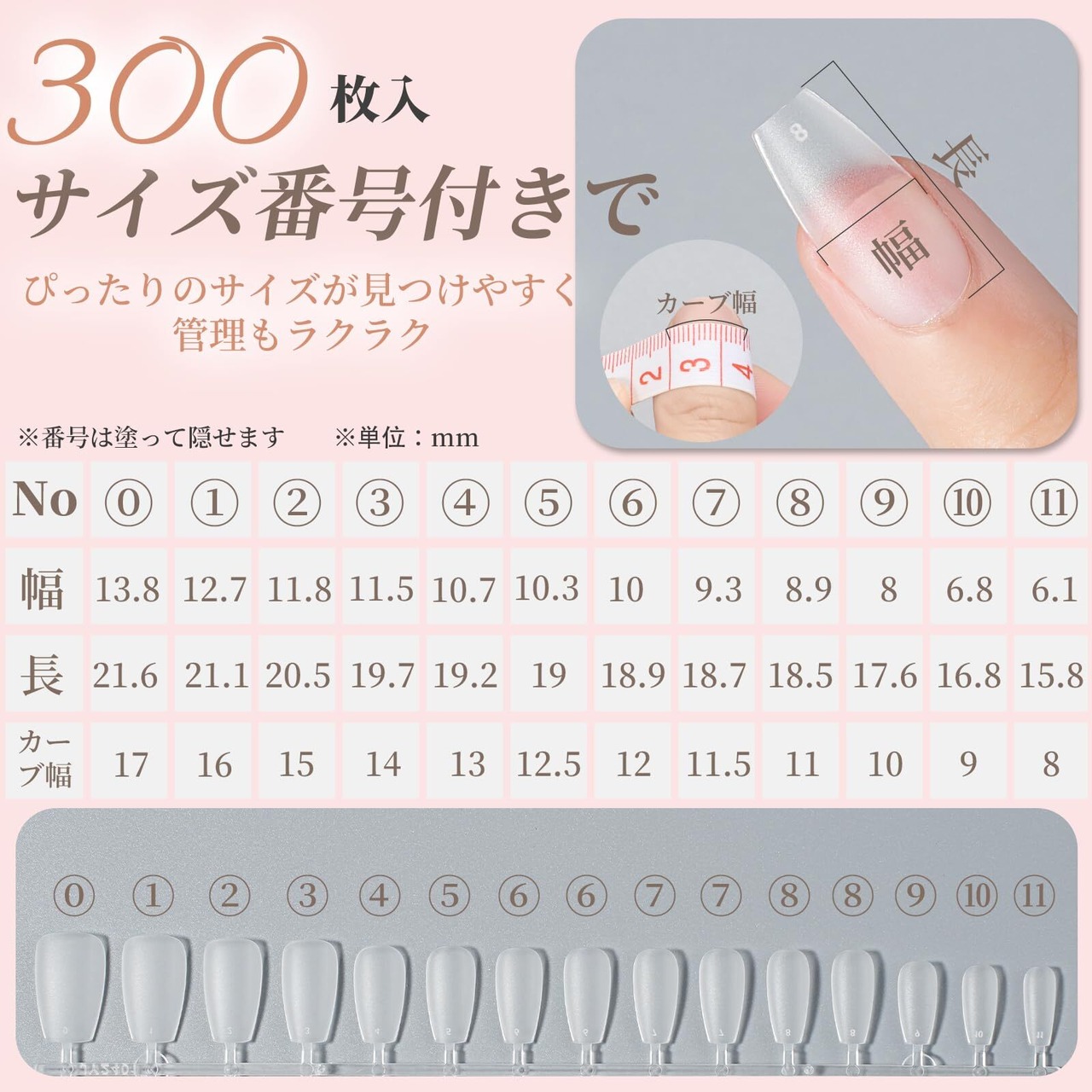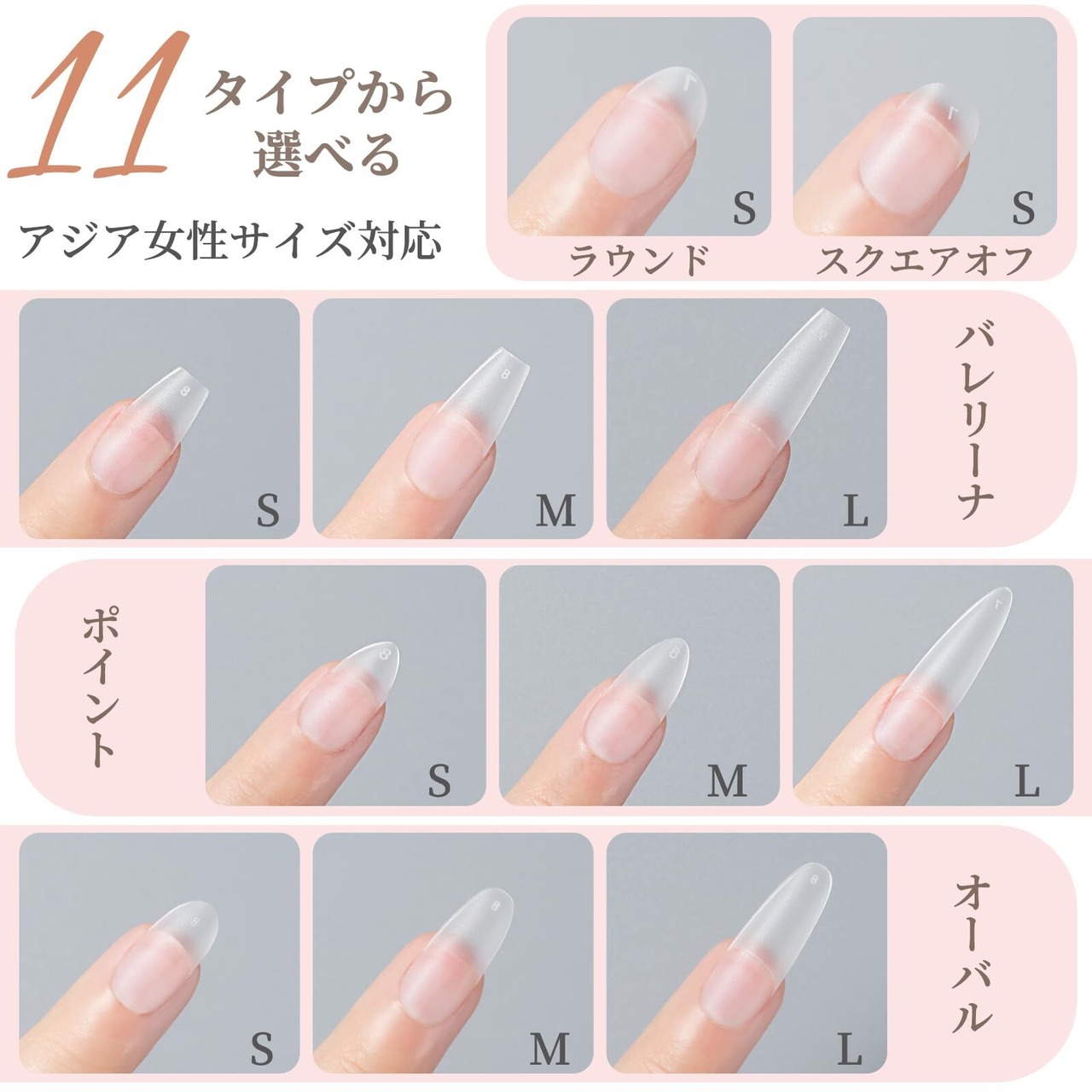 【使いやすさ抜群!】BEIHOOのクリアチップネイルは全11種のデザインをご用意。バレリーナ(S/M/L)、ポイント(S/M/L)、ラウンド(S)、スクエアオフ(S)、オーバル(S/M/L)など、多彩なスタイルから、お気に入りの透明 ネイルチップ がきっと見つかります。サイズ番号付きで、自分に合ったサイズがすぐにわかり、管理もラクラク。収納ケース(ボックスのツメのくぼみ部分を押し、指の腹で軽く持ち上げると、簡単に開けられます)・ネイルツール・日本語説明書付きで、初心者でも自信を持って始められます。