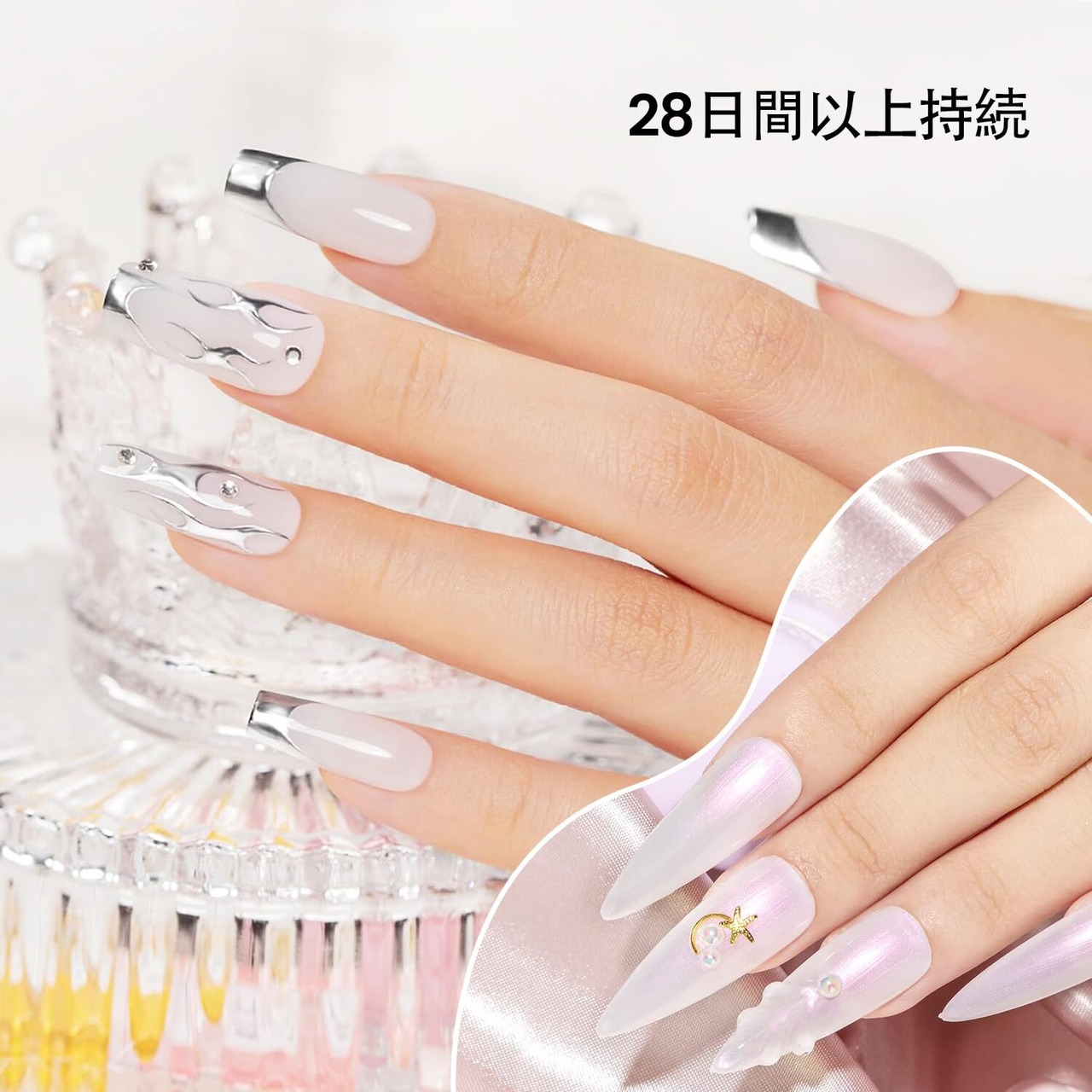 28日間長持ち:ネイルグルーは通常、強力な粘着力でパッチを爪にしっかりと固定し、剥がれにくくします。LED/UVライトで60~120秒照射すると強力な粘着力を発揮し、28日間以上使用できます。美しい爪を少なくとも4週間保ちます(マニキュアランプが必要です)。この3Dネイルチャームグルーは、様々なネイルデコレーションに最適です。