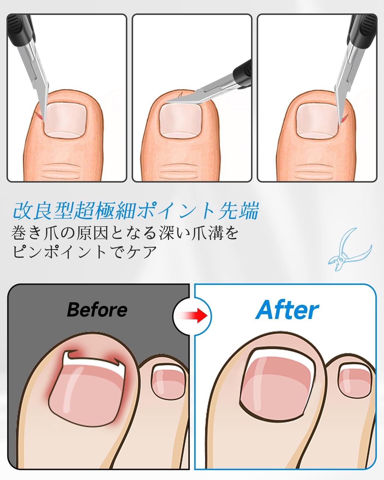 【ダブルV型 爪切り ニッパー】18mmに拡長されたブレードと30度の角度加工で、深い爪溝までしっかり届きます。巻き爪・厚爪・ささくれ・角質ケアに最適な設計です。超極細ポイントチップが埋もれた爪をケアし、ダブルVブレードで硬い爪もスムーズに切れます。