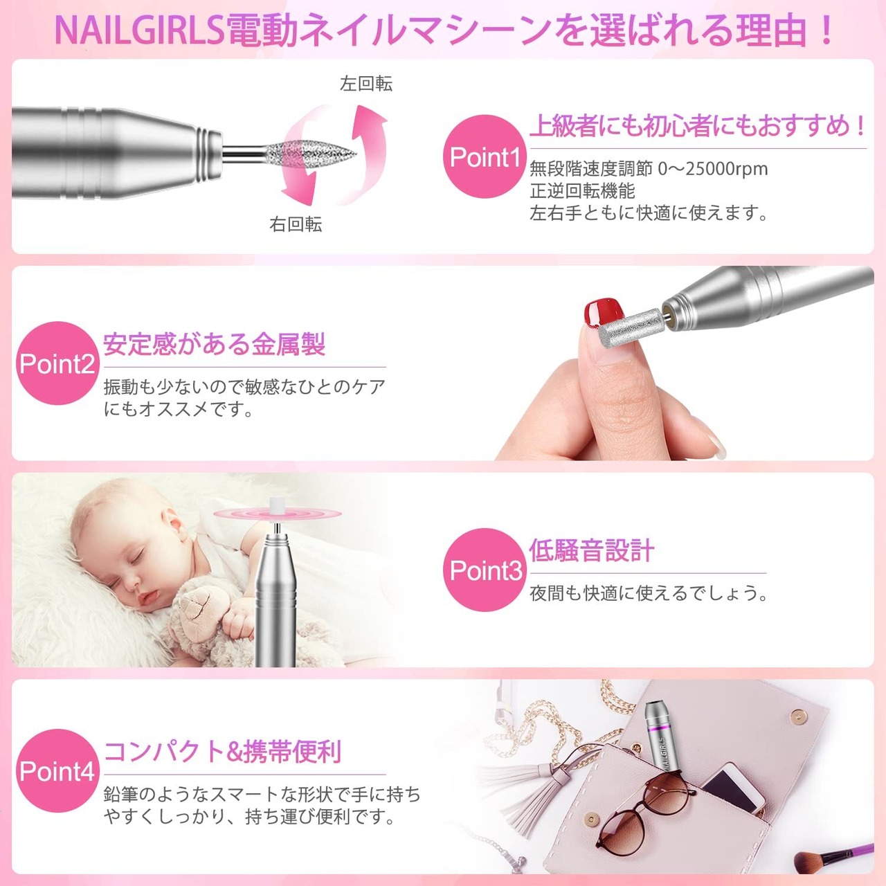 【無段階速度調節・正逆回転機能付きでネイル初心者におすすめ】NAILGIRLSプロ仕様の電動ネイルドリルは、 1分間の回転数が0~25000の無段階速度調整が可能ので、自分の好きなタイミングで少しずつ回転数を上げられます。なお、左右どちらの手で持っても回転方向をあわせることができるため、利き手以外の手でもスムーズに作業ができますよ。