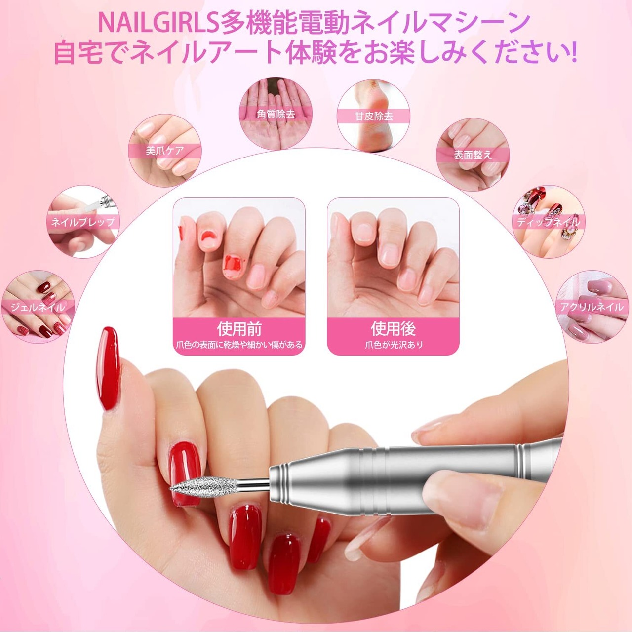 【ネイリスト推薦】 NAILGIRLS 電動ネイルマシン 11個のビット ネイルマシン 電動ネイルケアキット ネイルケア ジェルネイルケア オフ ネイルドリルマシン 研磨 爪磨き 甘皮処理 角質除去 正逆回転 低振動 マニキュア対応 無段階変速 USB給電 コンパクト 手足両用 25000rpm最大 自宅サロン用(グレー)