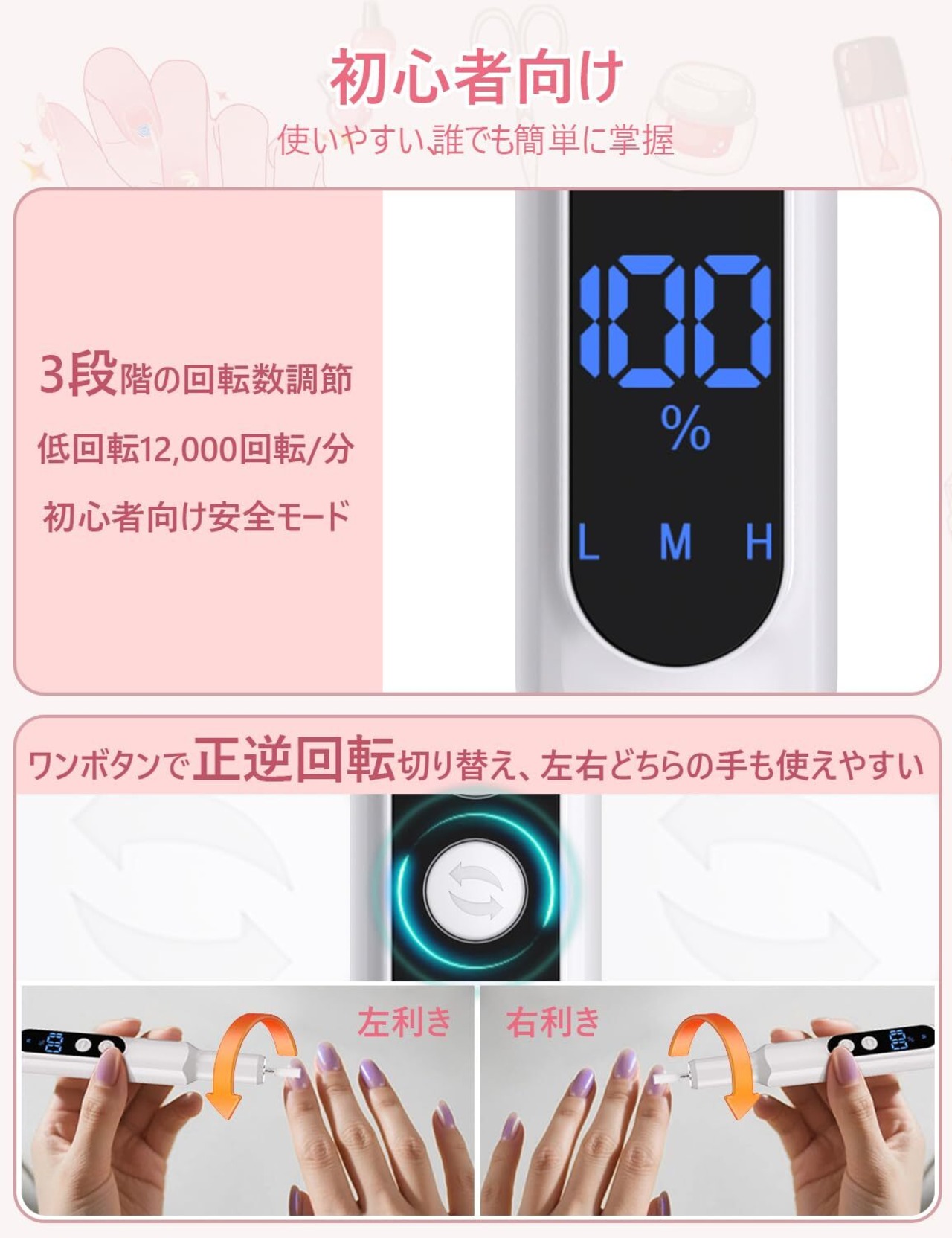 LEDライト搭載で、よりクリアで安全に この電動爪やすりは先端に4つの高輝度LEDライトを装備しているため、暗い場所でも細かいネイル作業が簡単に行えます。充電状態・速度モード・残量バッテリーはLEDディスプレイで一目瞭然。突然の充電切れの心配もありません。深夜の自宅ケアからサロンでのプロ仕様の作業まで、あらゆるシーンで活躍します!