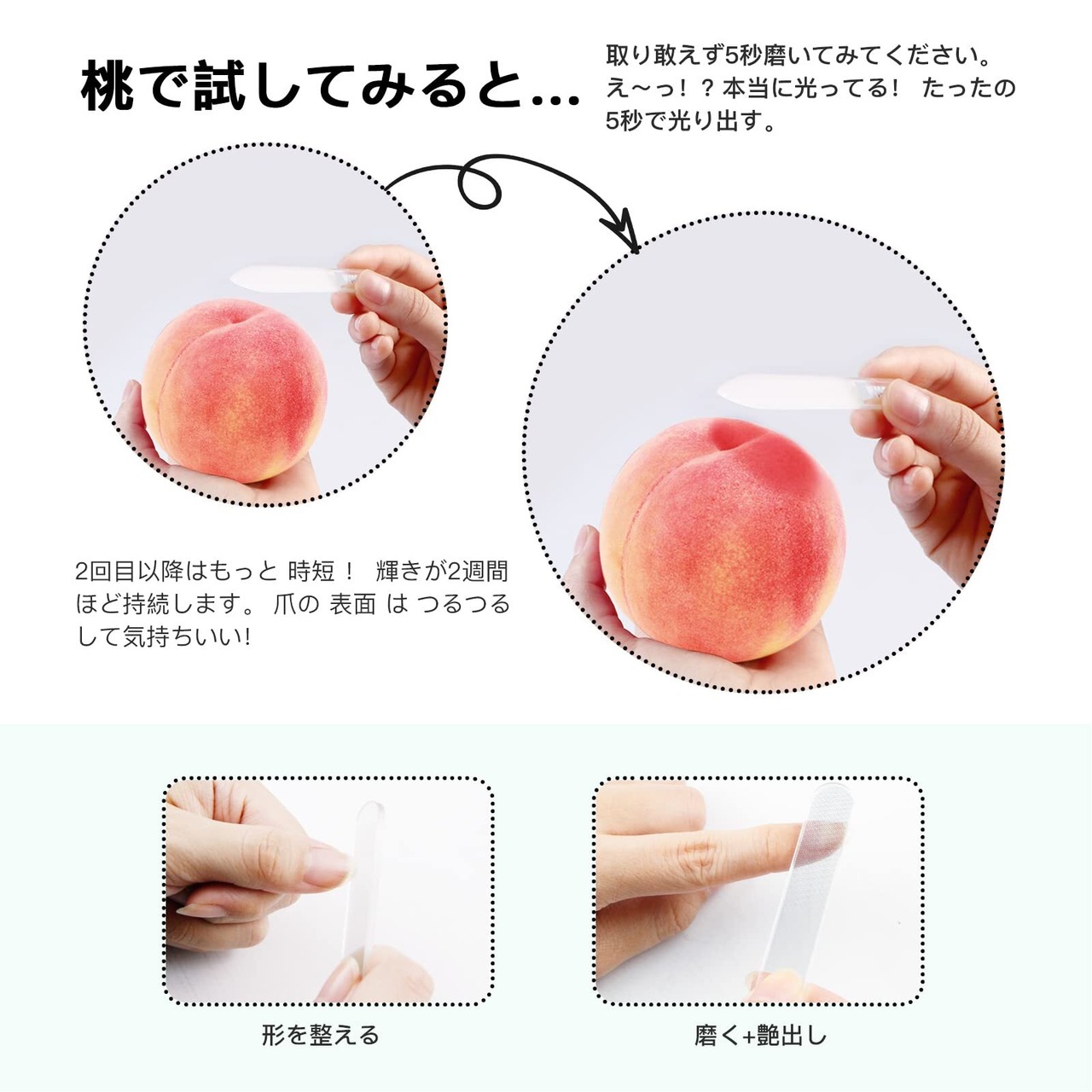 【エコで安全な爪やすり ガラス】この爪 磨きはガラスで作られ、物理的な研磨原理を利用して、最も健康な研磨爪を達成して、ピカピカで滑らかな艶を出す。よく見られる金属爪やすりが爪の表面に与えるダメージはありません。化学マニキュアが不要で健康です。臭いもなく、肌に刺激もなく、皮膚科医が極力おすすめている無害なネイルツールため、妊婦さん 、ギザギザ爪がすぐ伸びてくる赤ちゃん、職業上マニキュアができない方や男性にもお薦めです。※爪に縦ジマや凹凸がある場合はネイルファイルやネイルバッファーで下処理をしておくと均一に磨けます。輝きの持続期間は利用環境や個人差によって異なります。
