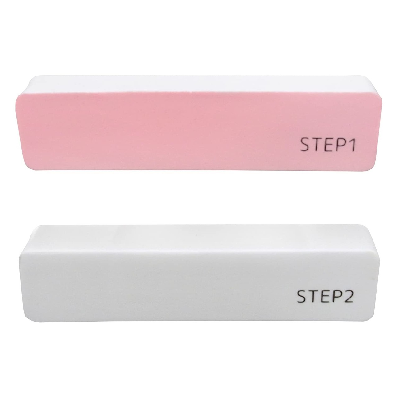 (1) ピンクの面で爪の表面の凹凸を整えます。