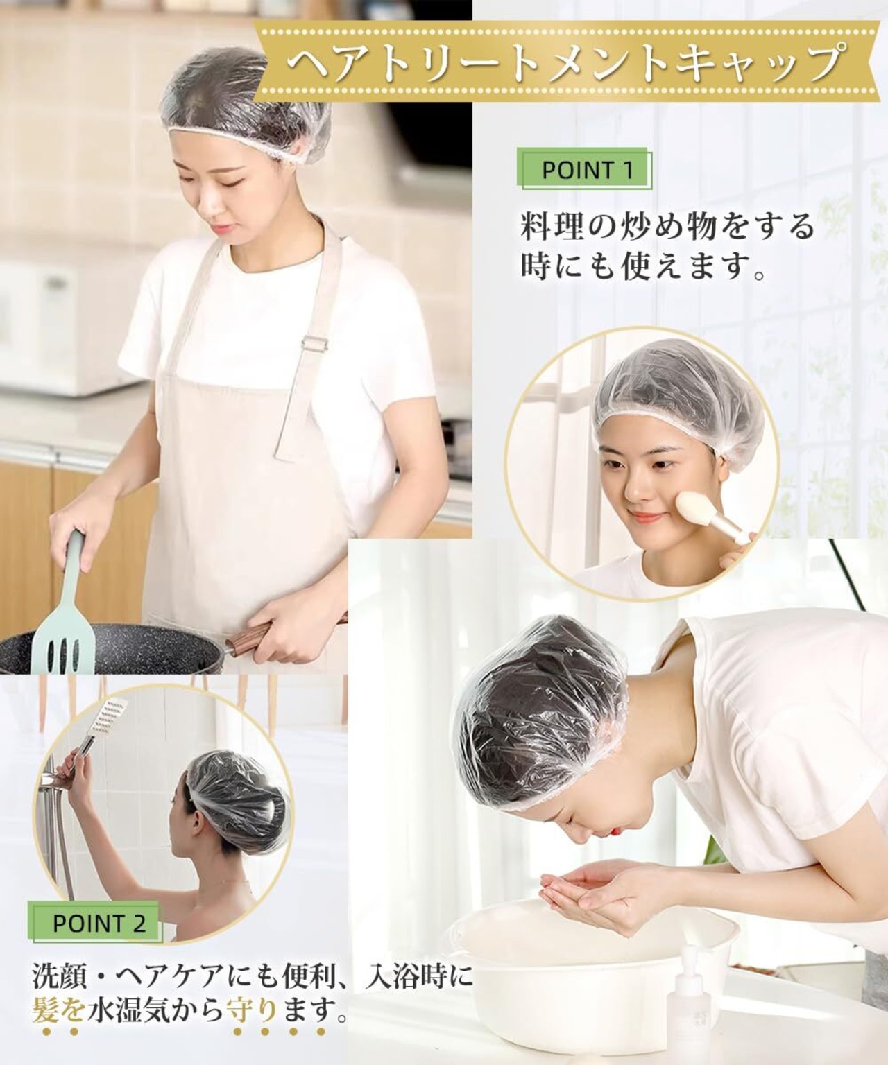 2●使い捨てで衛生的。髪を濡らしたくない・汚したくないときなどにご利用いただけるヘアキャップ。また、髪をスッポリ覆い、抜け毛の落下、フケ、ホコリなどの脱落も防ぎます。