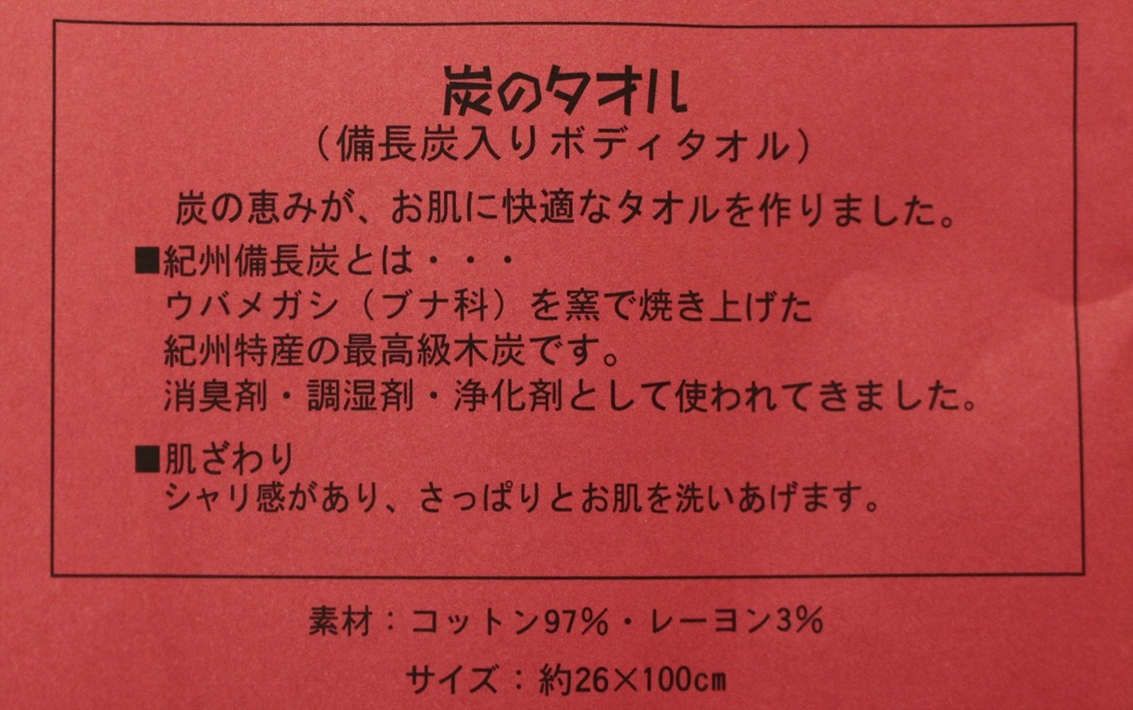 ●炭の恵みが、お肌に快適な備長炭入りボディータオル
