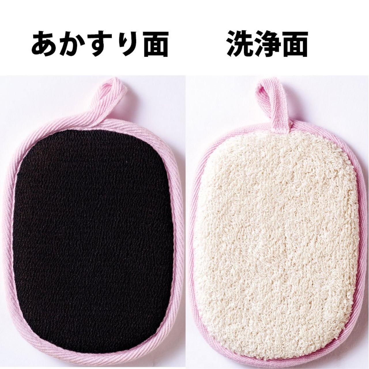●あかすり(黒色の面)・・・特殊しぼり加工の、蜜に織られた凸凹が、たまったアカ汚れを、しっかり落とします。スポンジパフのクッション効果で、肌への刺激をやわらげ、くびれ形状がぴったりフィット!●ボディタオル面(桜色)・・・やわらかな肌ざわりとクリーミィな泡立ちで汚れをしっかりオフ。あかすり後のお肌にもやさしく洗えます。