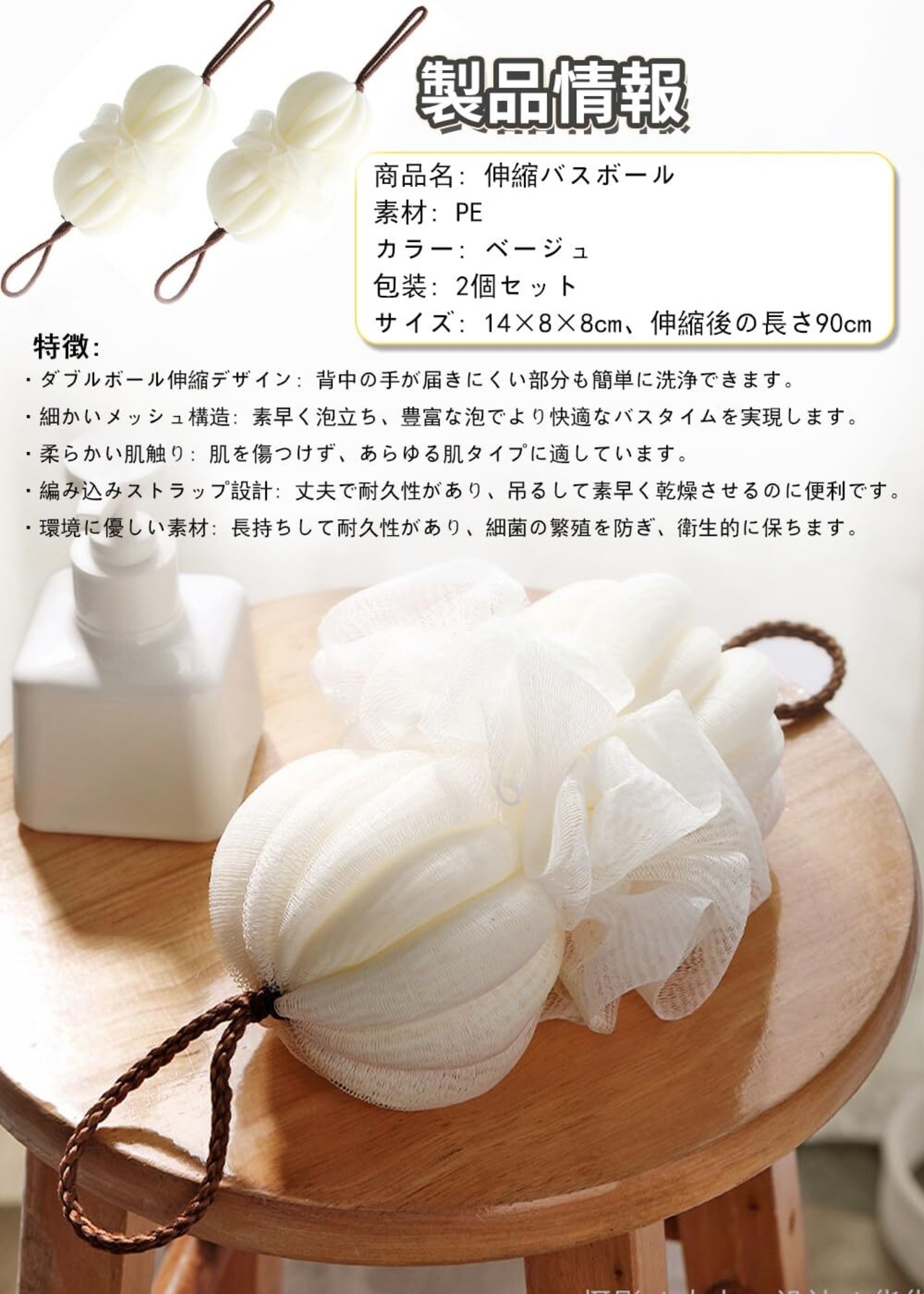 使用方法:ネットを軽く引っ張って広げ、ボディソープを少量入れ、泡立ててから全身に塗布します。洗い終わった後はすすぐだけで、乾燥させるだけで繰り返し使用できます。