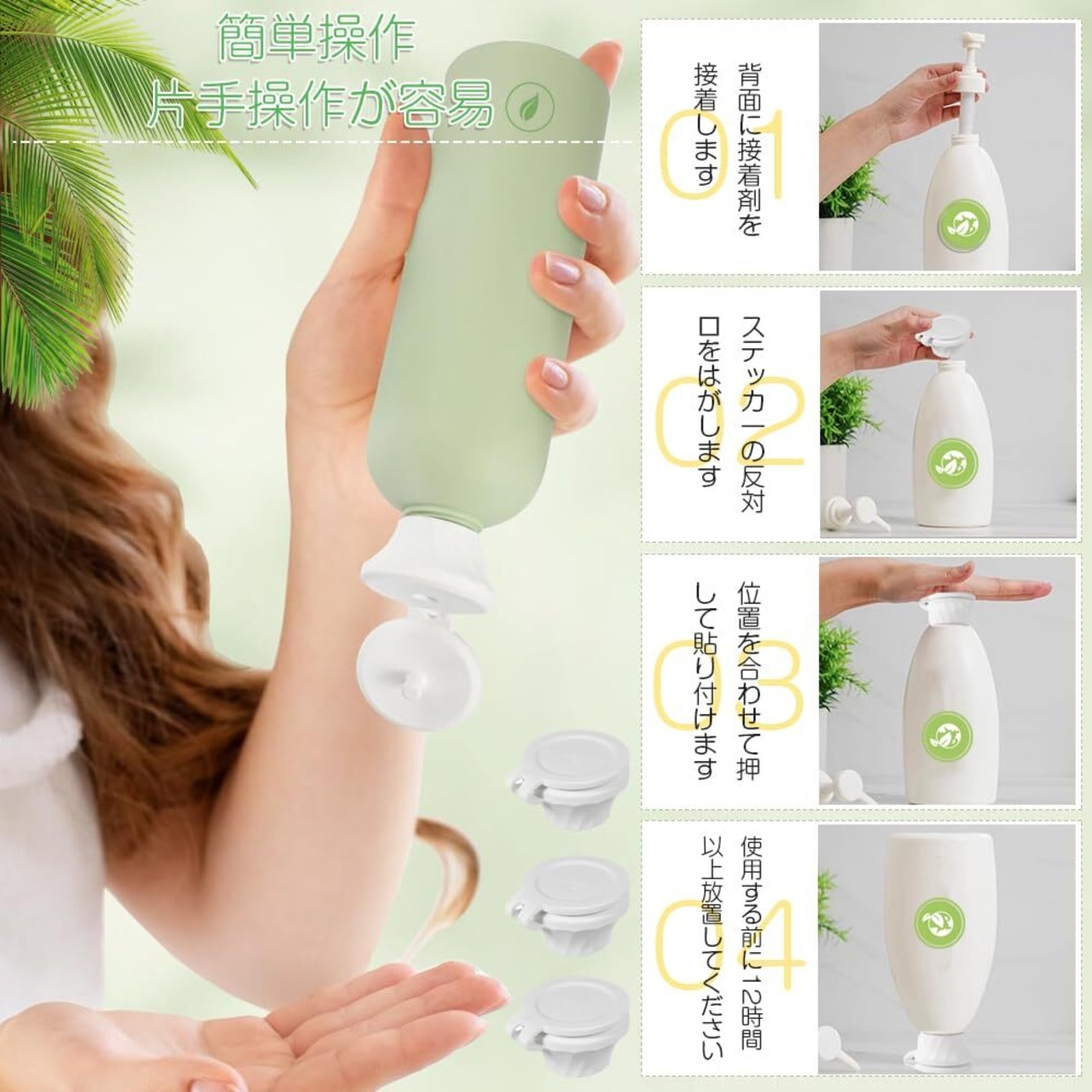 用途:このキャップは、バスルームではシャンプー、コンディショナー、シャワージェルに、キッチンでは調味料に、スキンケアではローションやシャワージェルに適しています。また画期的な逆さ使用により、家庭用品の使用量を増やすことができます。