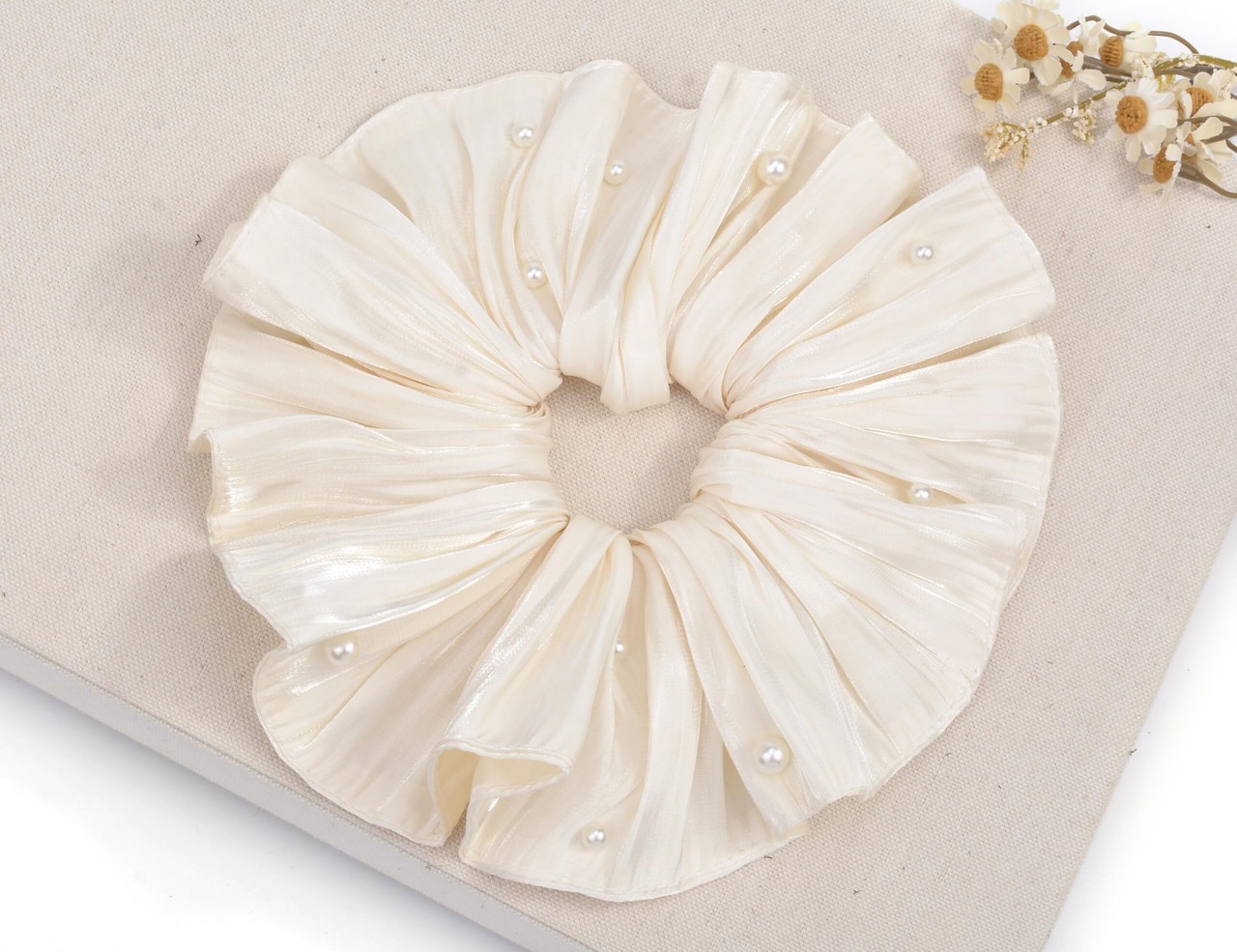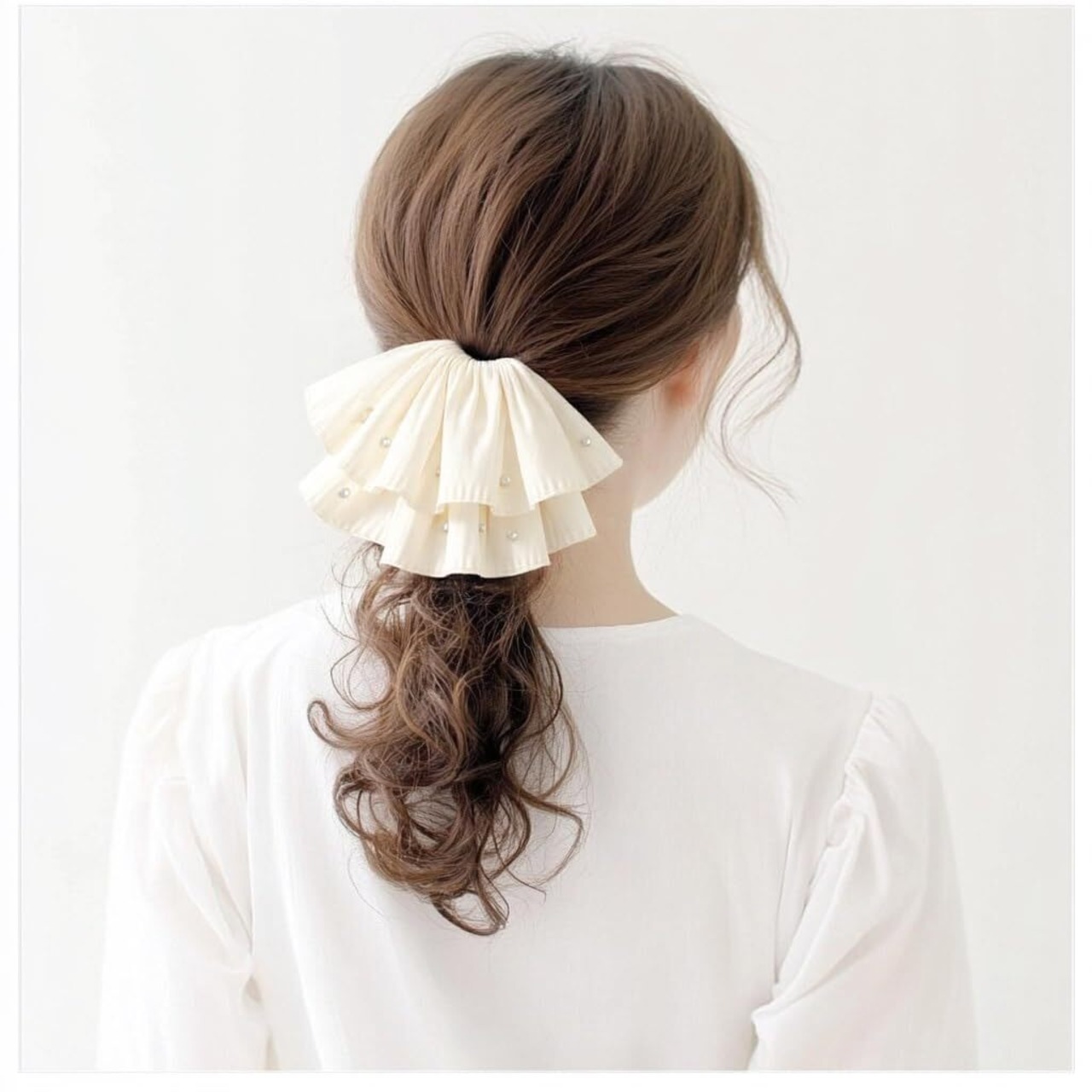 上品な透け感のオーガンジー生地にメリハリパイピングを施した大人可愛いシアーオーガンジーシュシュ。