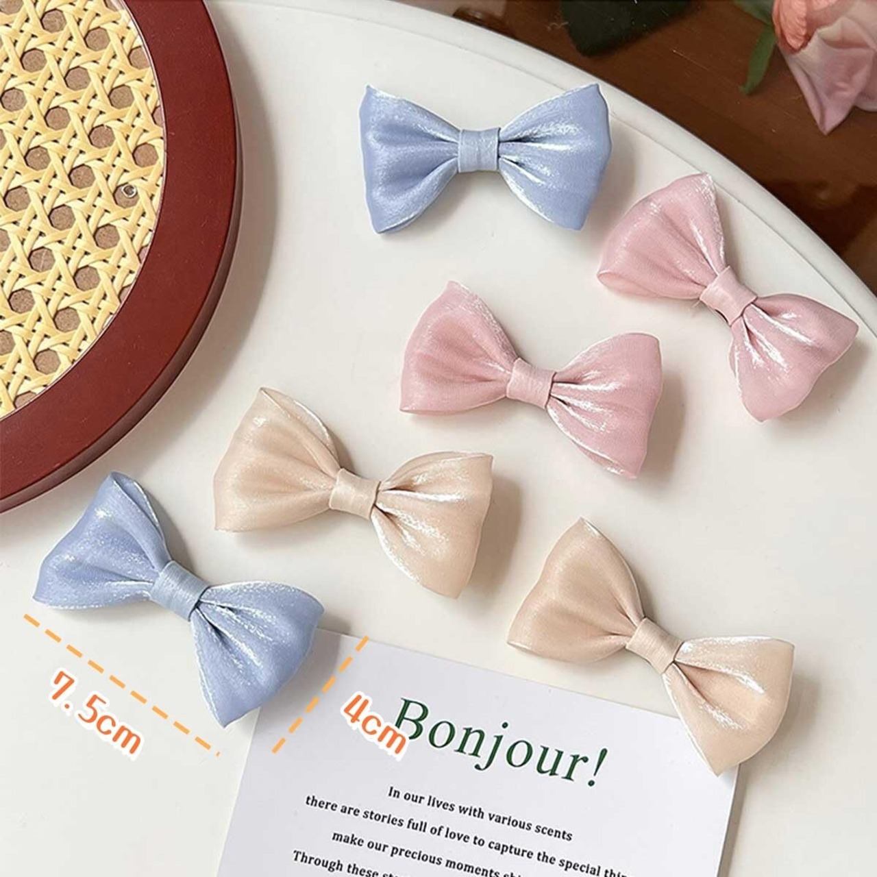 【サイズ】:長さ:7 .5cm、幅:4 cm、数量:6個セット、色: ブルーX2 + オフホワイトX2 + ピンクX 2。あらゆる髪のサイズにフィットします。 あなたを甘くエレガントにすることができます。