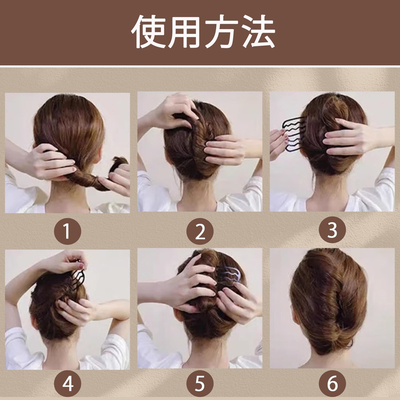 【製品仕様】夜会巻きコームはSサイズ(長さ8.8cm×幅5cm)とLサイズ(長さ7.6cm×幅6.5cm)の2サイズをご用意しております。各サイズ1個入り、小さなヘアピンが3つ付属(合計5個)で、髪量の多い方から少ない方まで、あらゆるお客様の日常的なニーズにお応えします。軽量設計のため携帯に便利で、店主自ら試用した結果、髪をしっかり固定し一日中崩れないことが確認されています