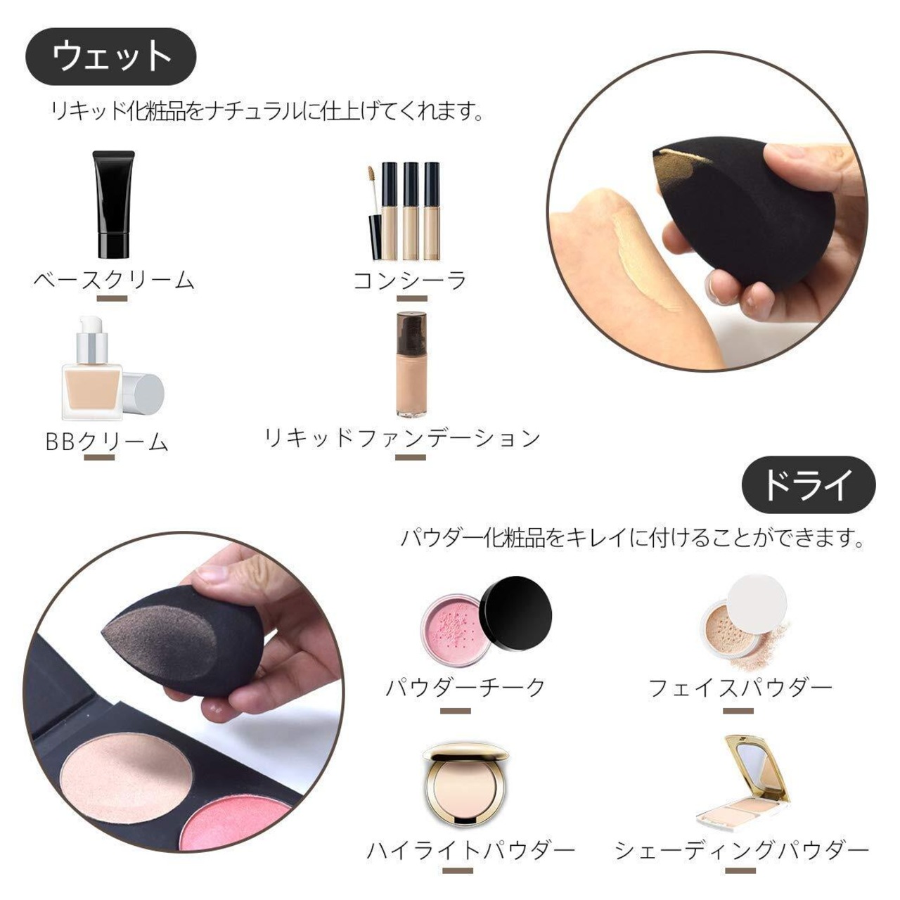 商品用途・使用方法 ベースクリーム,コンシーラ,BBクリーム,リキッドファンデーション,パウダーチーク,フェイスパウダー,ハイライトパウダー,シェーディングパウダー