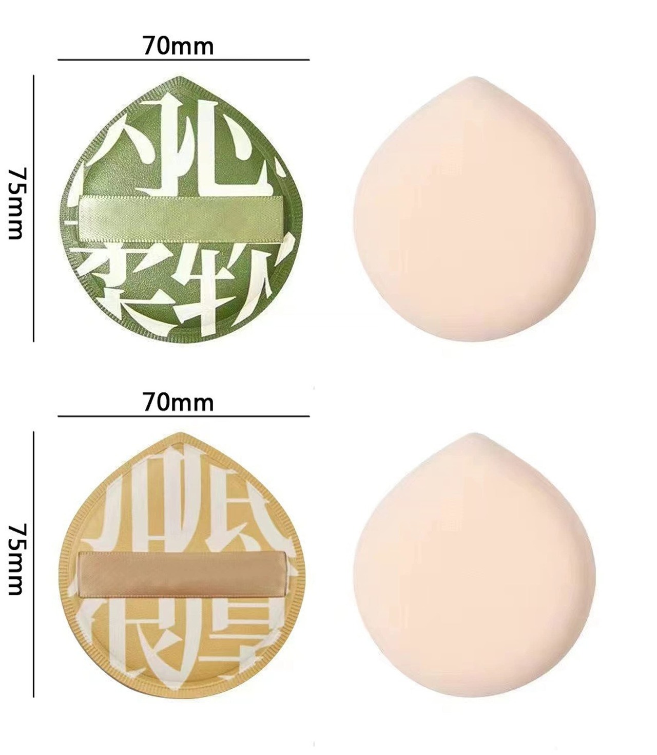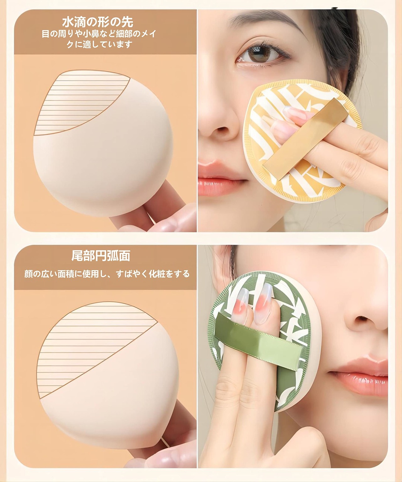 【しずく型パフ - 円弧の尾部は】しずく型パフ,円弧の尾部は、たたく力を均一に分散させ、大面積のたたく塗布効果をより良くすることができる.