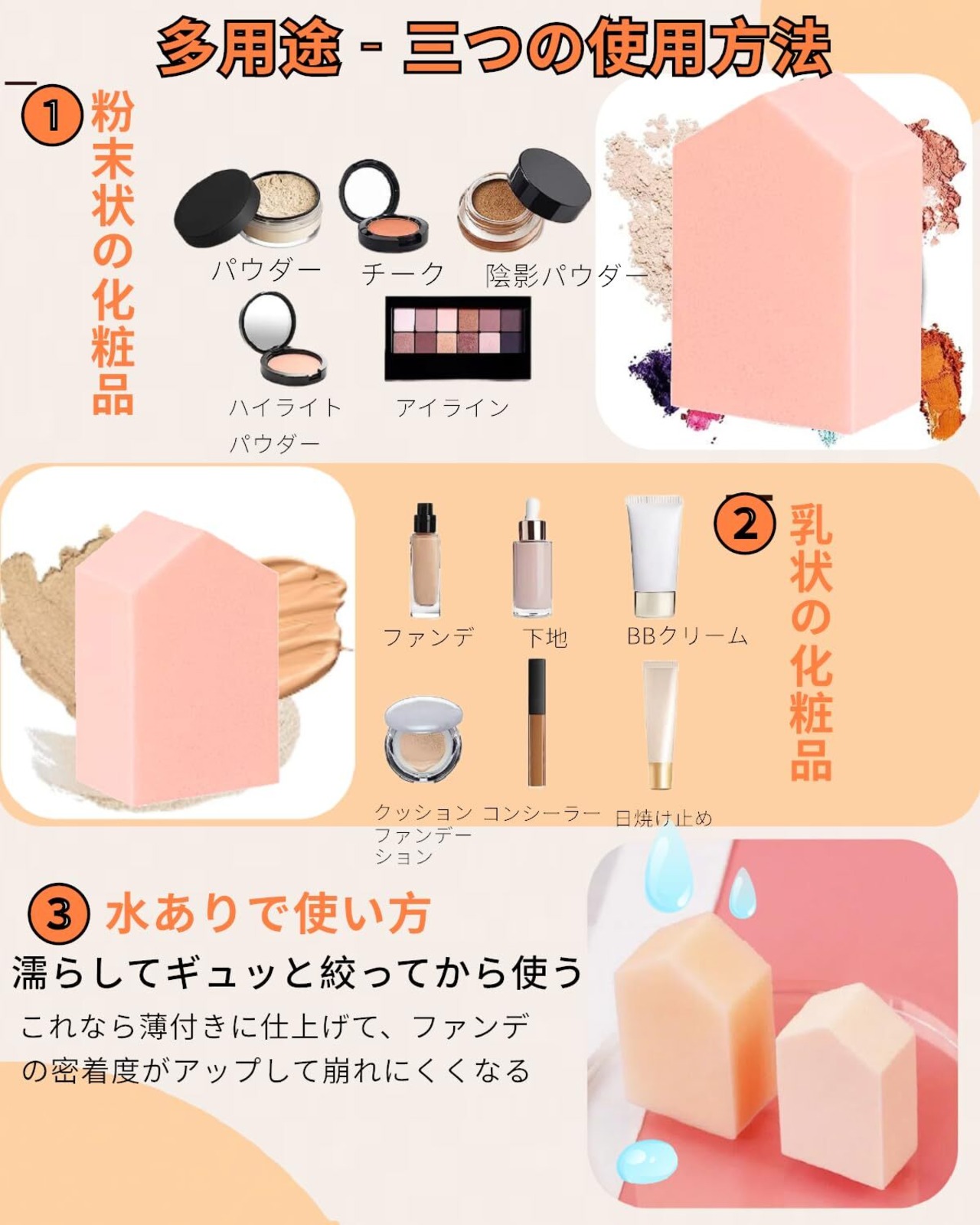 【水あり水なし両用タイプ】水なしで使うのはスポンジで乾いたままにファンデ・パウダーなどを肌に使用可能です。水ありで使うのはスポンジを濡らしてギュッと絞ってから使うものです。これなら薄付きに仕上げて、ファンデの密着度がアップして崩れにくくなります。